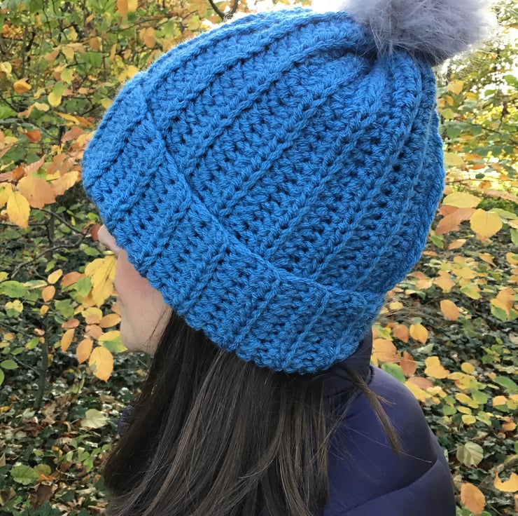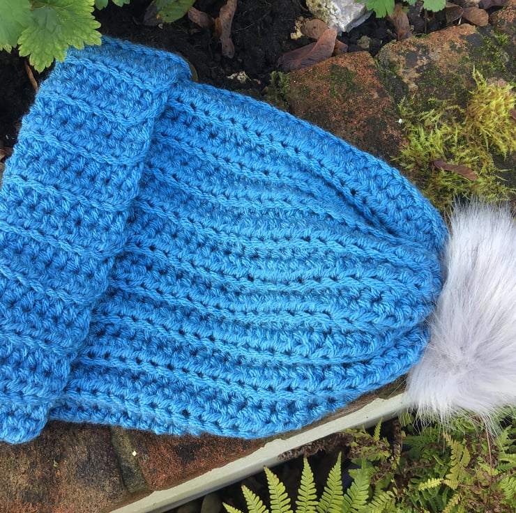 This hat is handmade using a chunky acrylic yarn. (no itching). In Cornish Blue. (Please note the colour may differ slightly on your screen).
