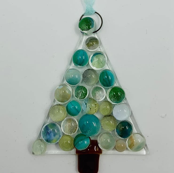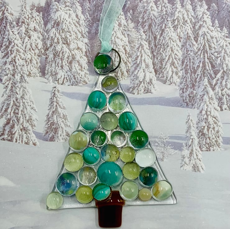 Handmade Fused Glass Xmas Tree Hanging Christmas Decoration.
