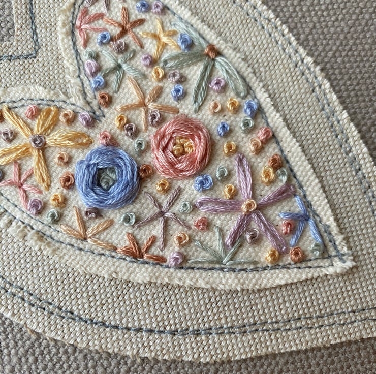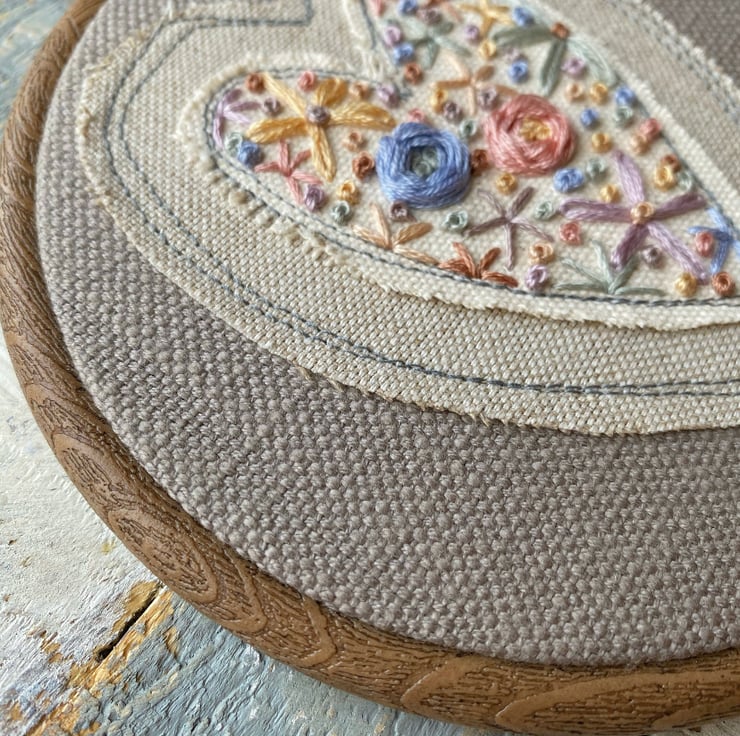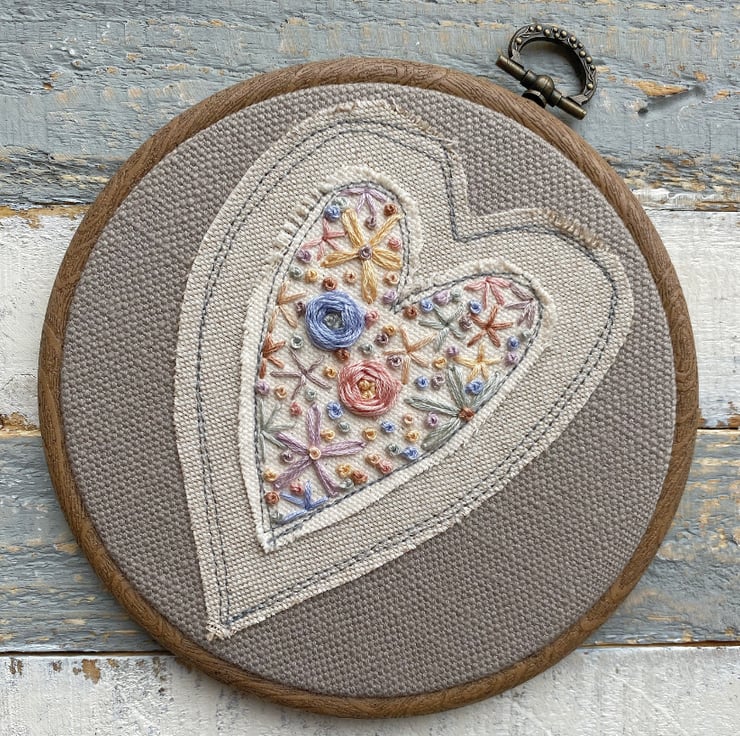 A pretty 5” appliqué heart design with floral details in pastel colours on a fawn coloured background.