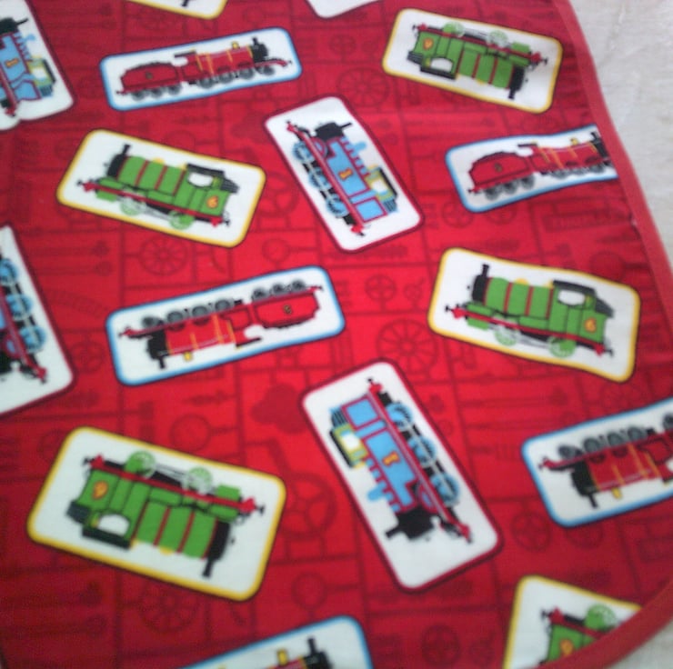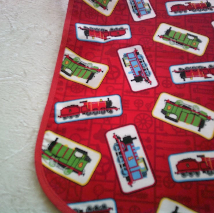 The design features Thomas the Tank Engine along with his friends, Percy and James on a red background and is edged with red bias binding.