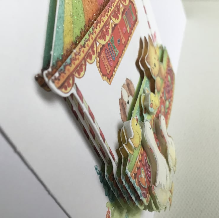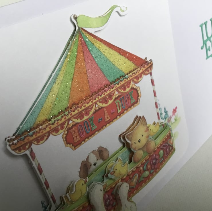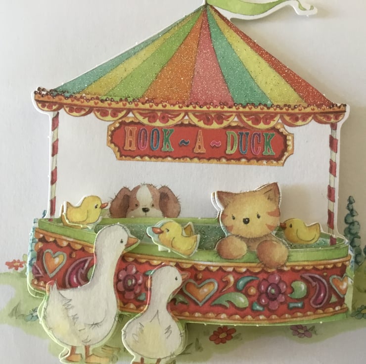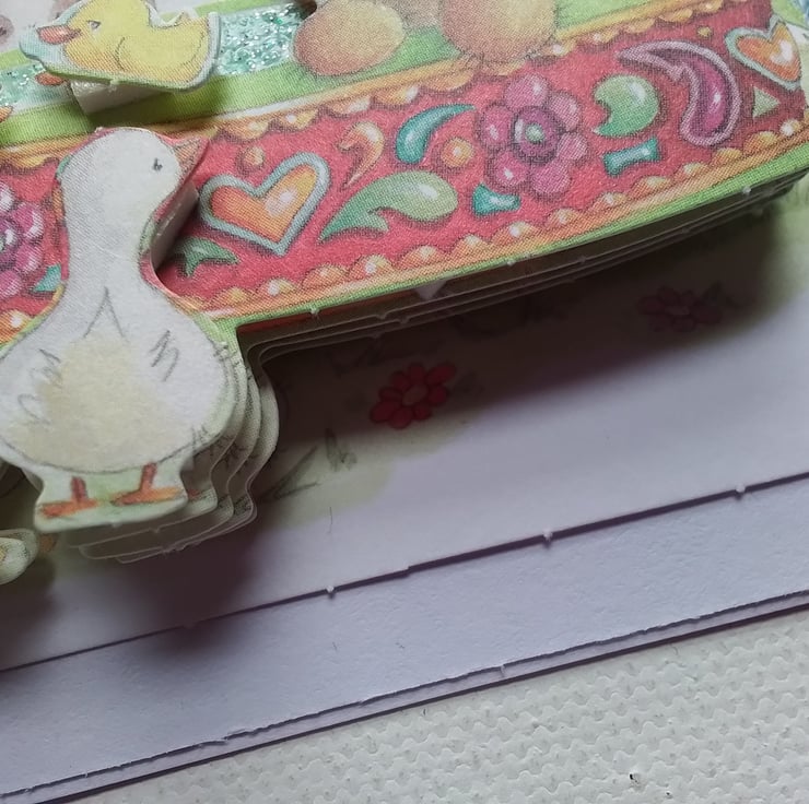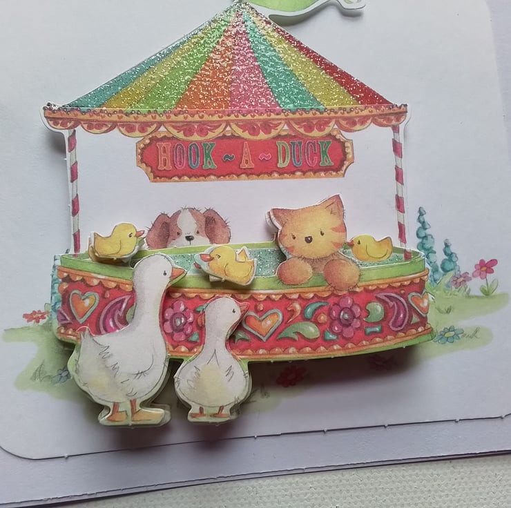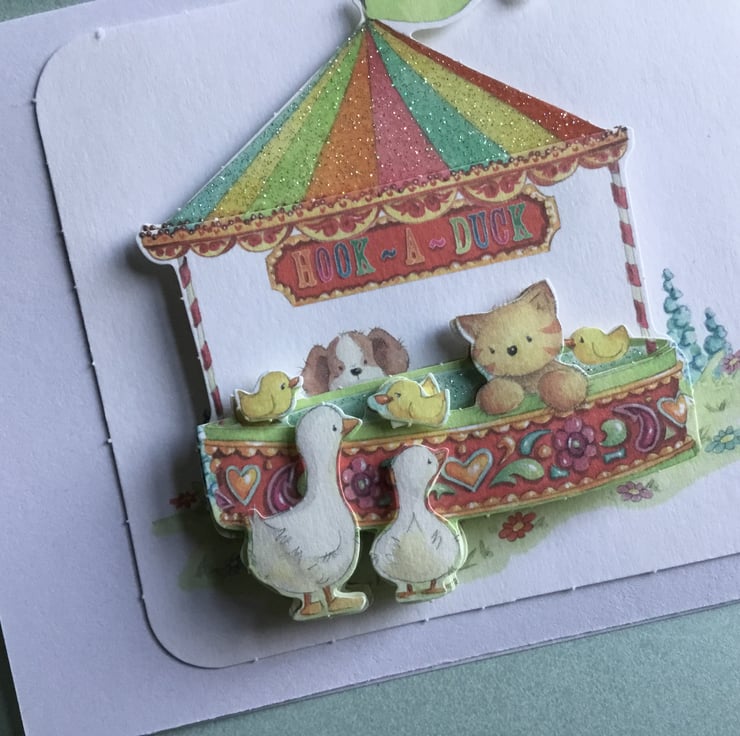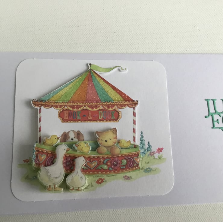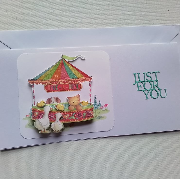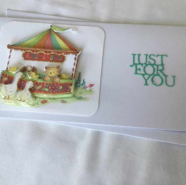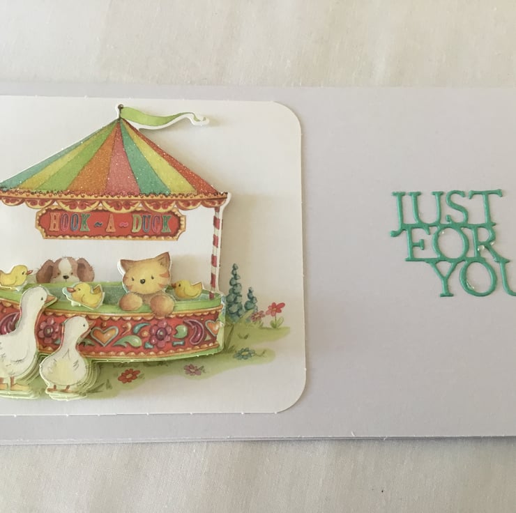 This cute decoupage card features a layered hook a duck scene with the lovely topper ‘just for you’ in a subtle shade of green.