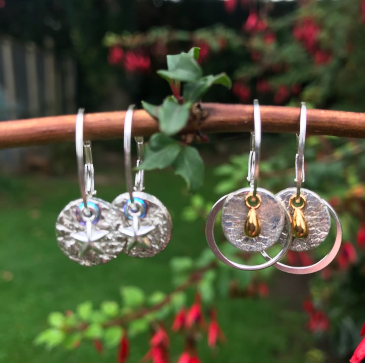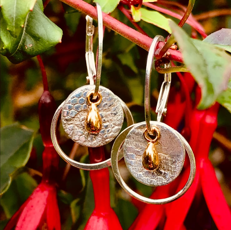 Mini solid silver discs set on a sterling silver lever back earrings with a mini gold droplet charm.and a silver ring.