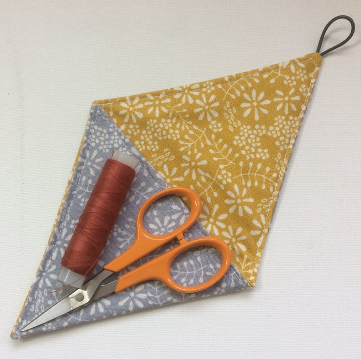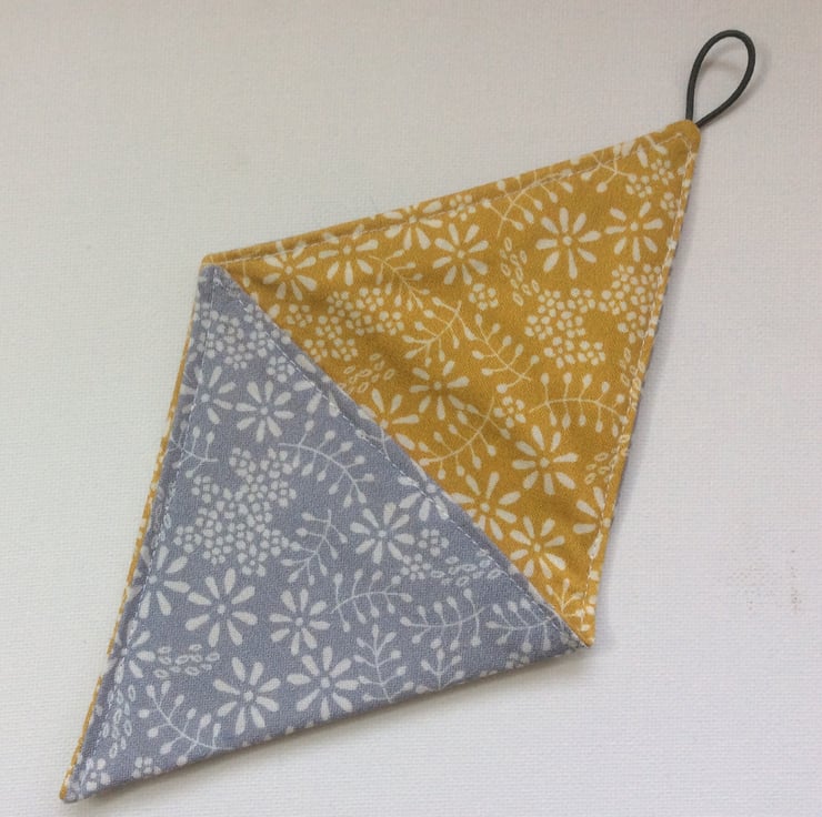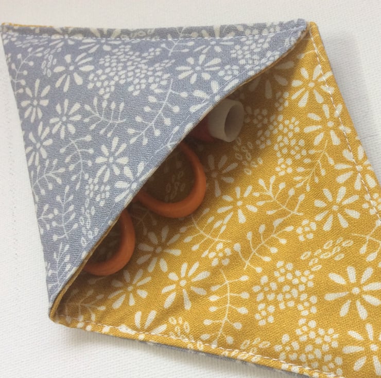 This small coin purse is perfect for change for the car park, a small sewing kit or other small items that need to be kept safe. It is made from silver grey cotton with a white floral pattern. The lining is a matching gold cotton. The purse is approximately 11cm x 11cm x 11cm. It has a grey elastic loop and matching button closure.