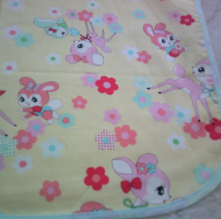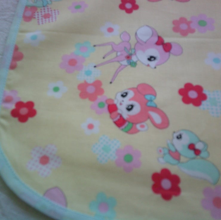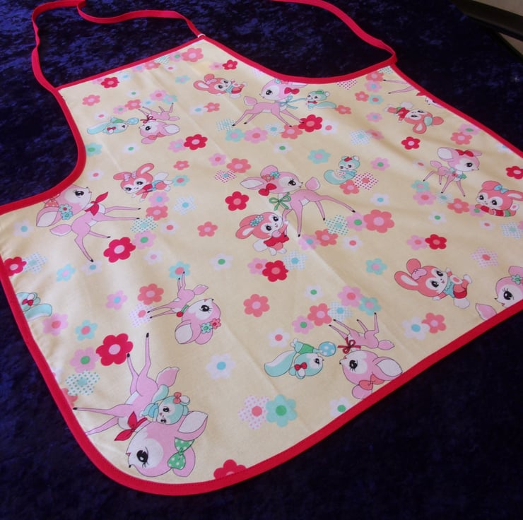 This Apron features baby deer with Rabbits, Squirrels and flowers on a pale lemon background and edged with red bias binding.