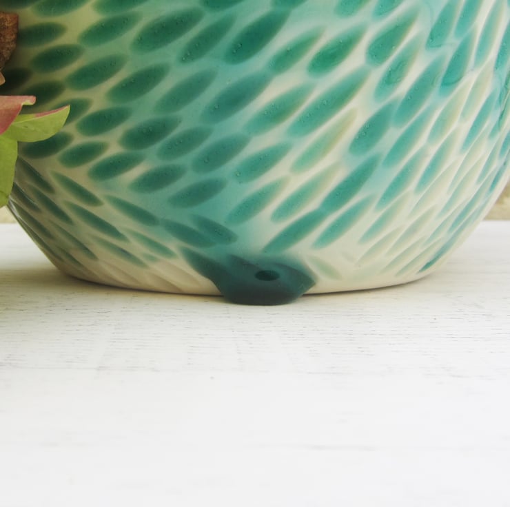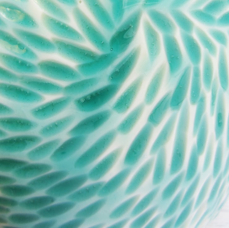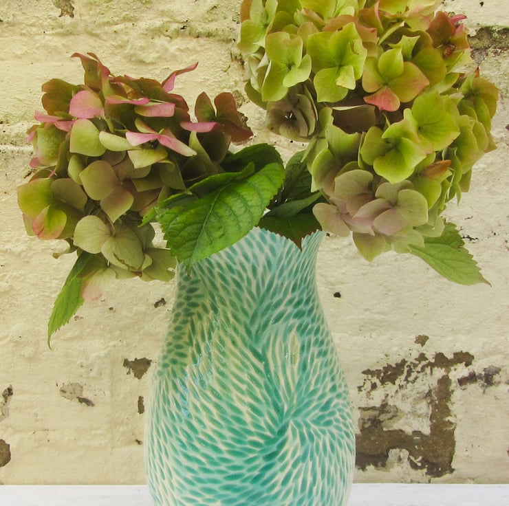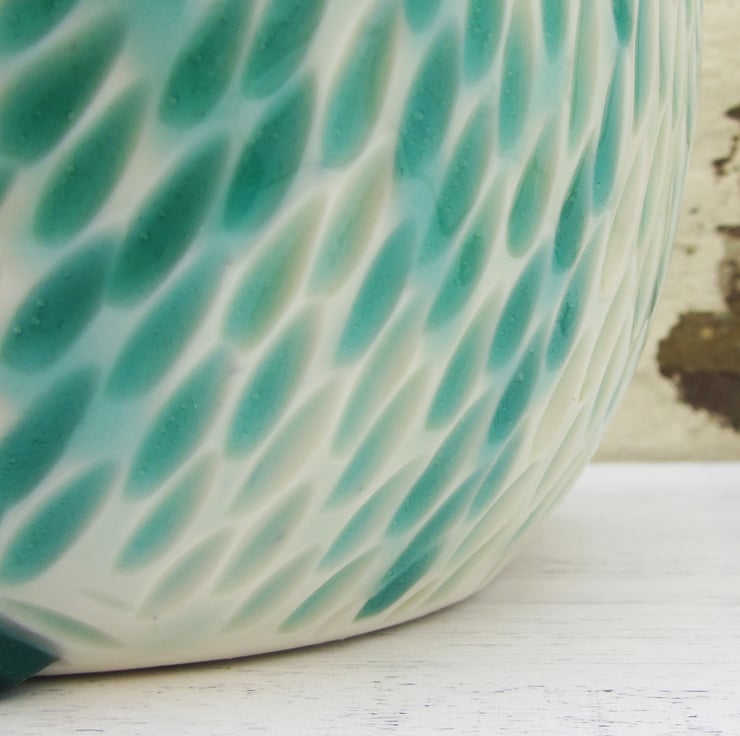 These carvings are one of my new patterns, inspired by the centres of dahlias, with a sea green glaze. The glaze is a deeper colour in the carvings. Its glazed on the inside to make it easier to keep it clean.