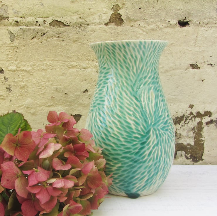 I love to make and I love all things floral. I've combined these two loves and make vases. I love to carve all my porcelain work to give a tactile texture to the vase. This particular shape is named Anna. I've taken to naming my vases after the inspirational women in my life, who have supported me and guided me.