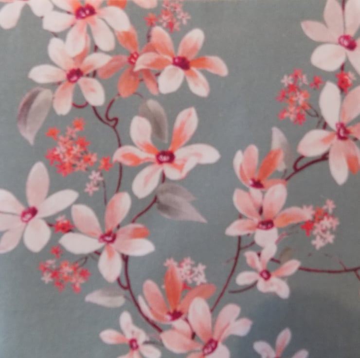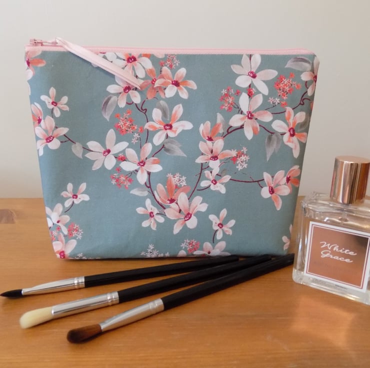 It is made from a lovely quality cotton fabric, featuring pink Japanese cherry blossom flowers on a muted grey/blue background.