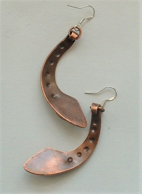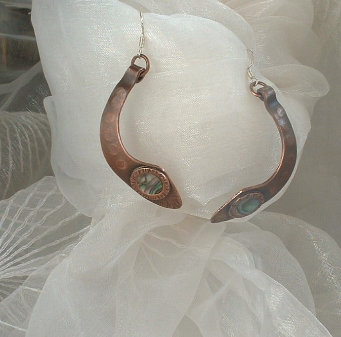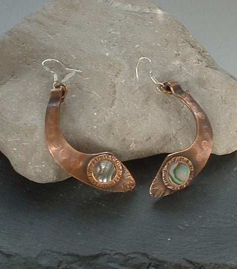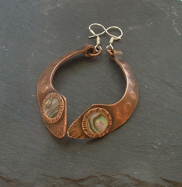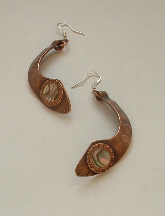 They are made from copper plate cut and filed to shape, then hammered with a dapping tool to add texture and curve. A textured copper washer has been soldered in place and circles of mother of pearl added to give them a lovely iridescence.