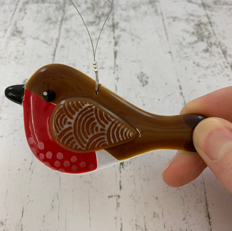 I hand cut and shape transparent art glass in red and deep brown and fuse it overnight in my kiln. I then add an opaque tan coloured wing which I've painted with white enamel paint in a delicate pattern, an eye and a beak in black glass and add shimmery red dots on his tummy. I then slowly fuse the robin again in my kiln overnight. Body is transparent glass, wing and beak are opaque.