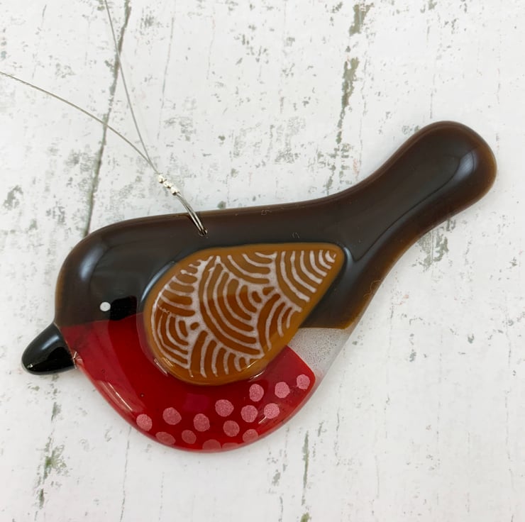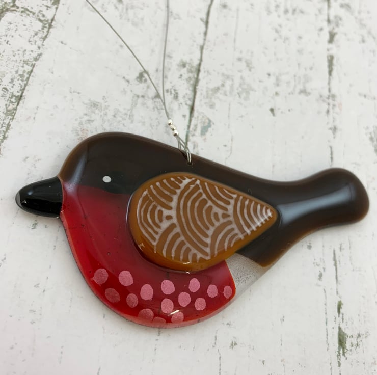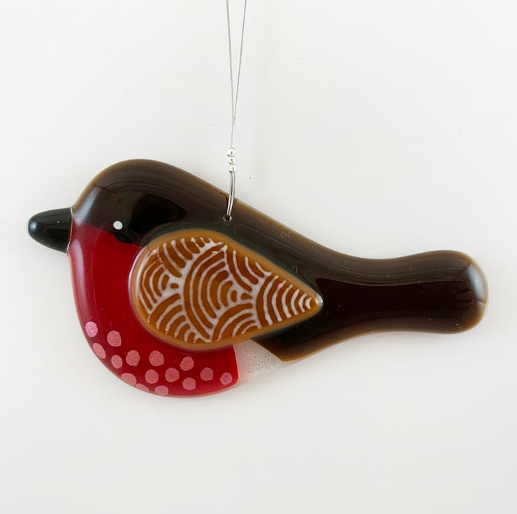 Fused glass hanging robin. This cute glass hanging robin sports jazzy shimmery red dots on his tummy and an intricate patterned wing. He would make a lovely Christmas present and looks great on a Christmas tree.