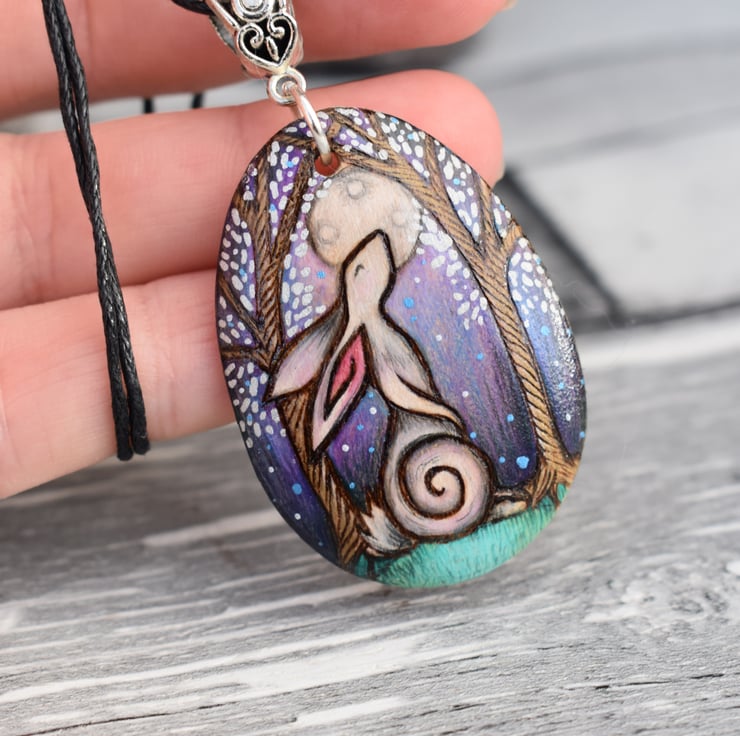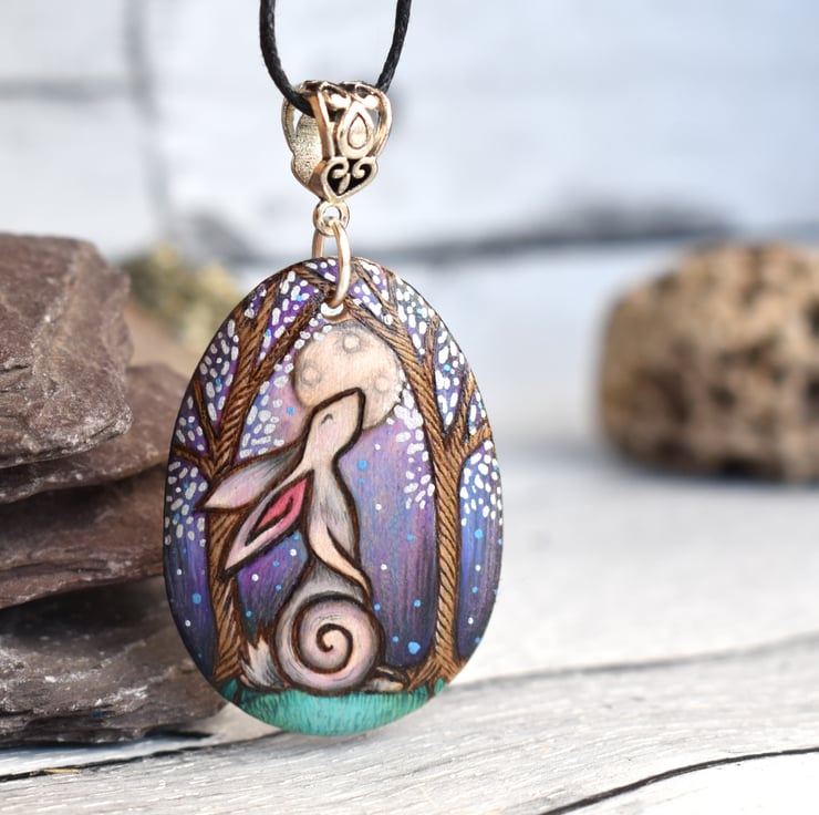 A moon gazing hare sits on this teardrop pendant, standing between two trees, with metallic wintery leaves. A full moon in a calm and cool sky behind lies behind with touches of purple spreading from the horizon. Hand burned using pyrography or wood burning. Coloured with art pencils.