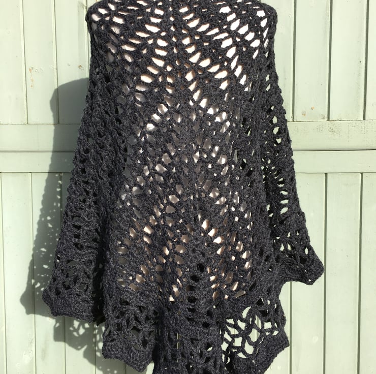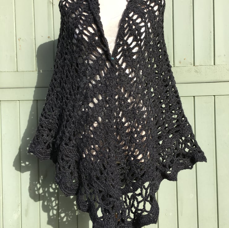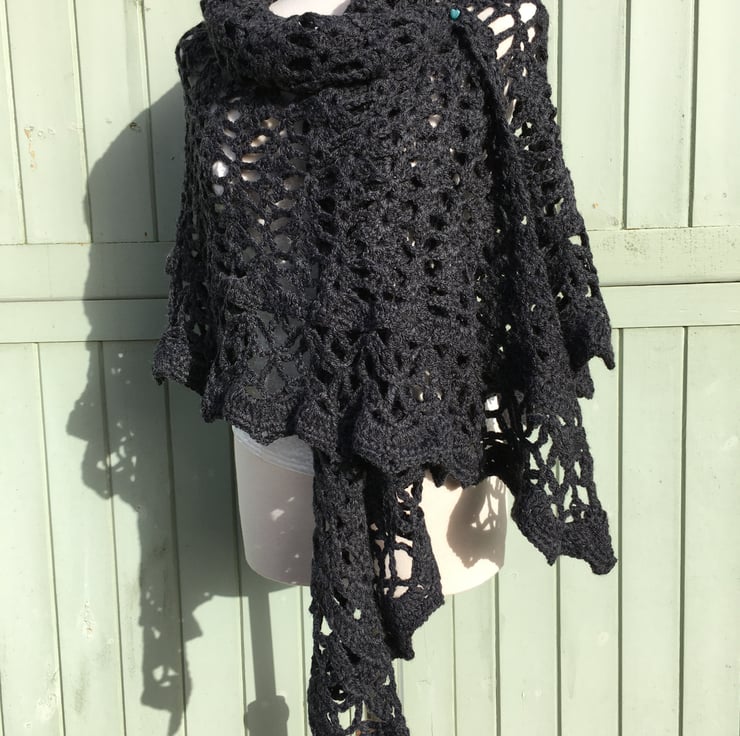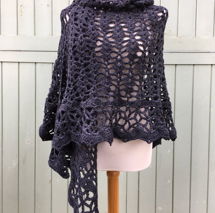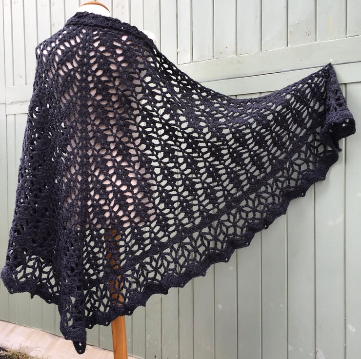 Designed and hand crafted by me, this triangular shawl is cosy and generous in size. Photographed on a size 12 dummy