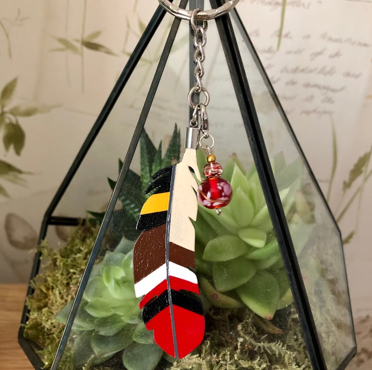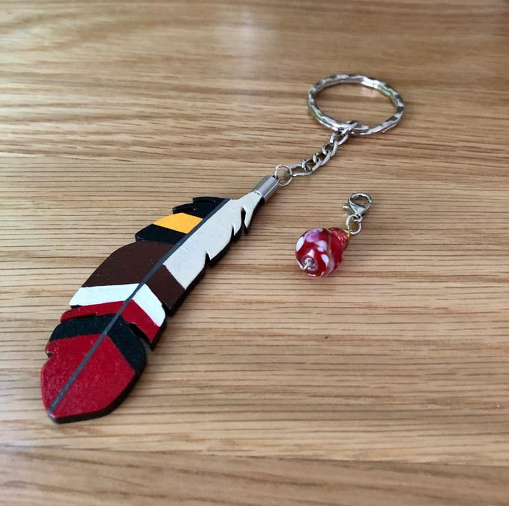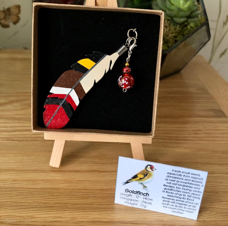 A unique hand-painted wooden keyring with a varnished finish inspired by the plumage of a goldfinch and removable bead charm.