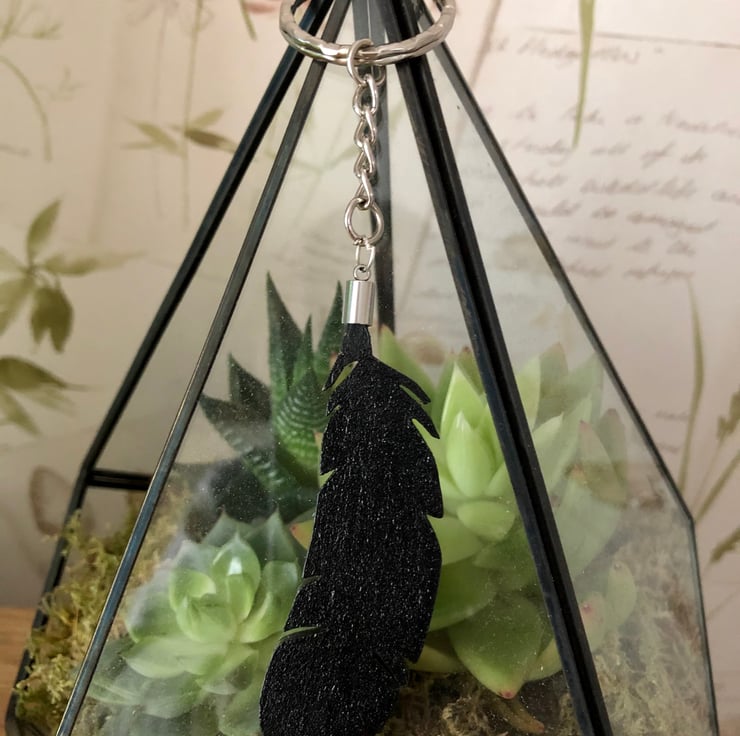 Made from a 75mm MDF feather craft shape and a stainless steel end cap attached to a 25mm ripple effect split ring.