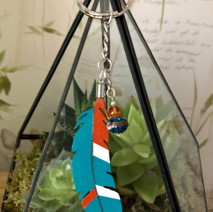 A unique hand-painted wooden keyring with a varnished finish inspired by the plumage of a kingfisher and removable bead charm.