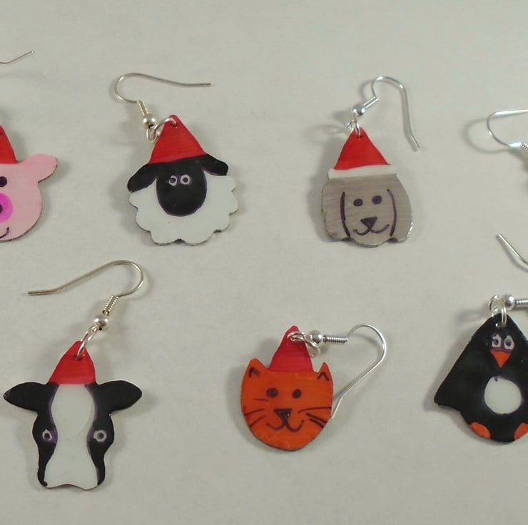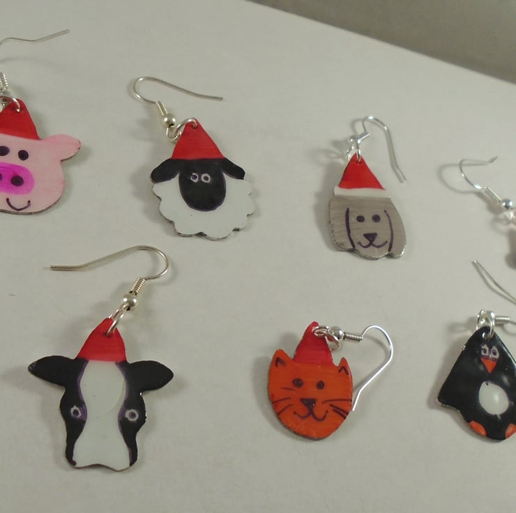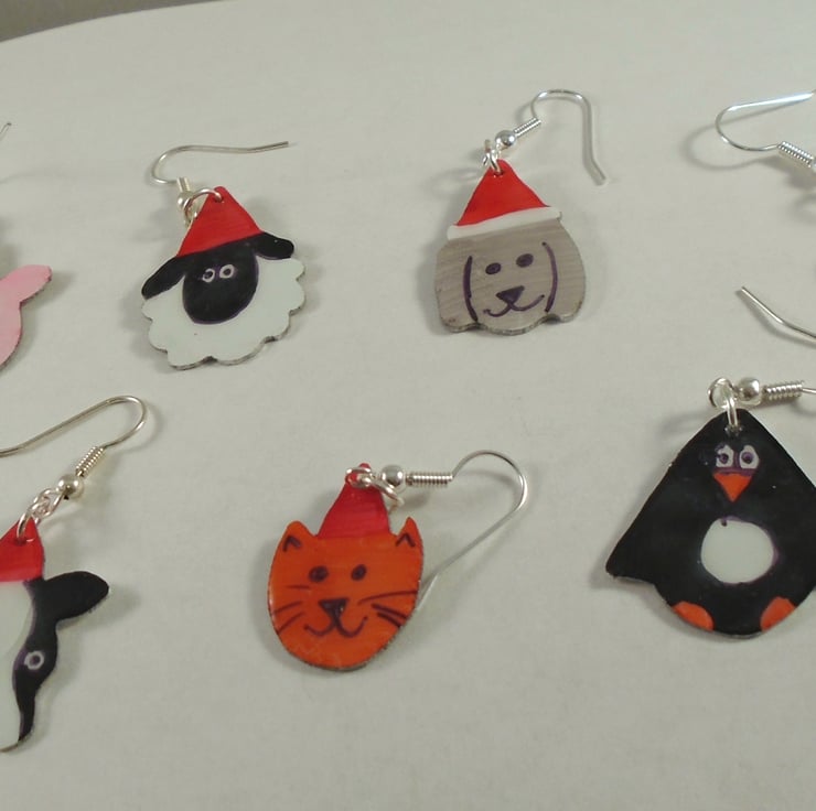 A quirky and unusual set of christmas earrings, enough for the whole week of Christmas! All of the earrings have been hand pierced from a sheet of aluminium, and hand coloured. They have then been coated in enamel to protect them, and hung from silver plated ear wires.
