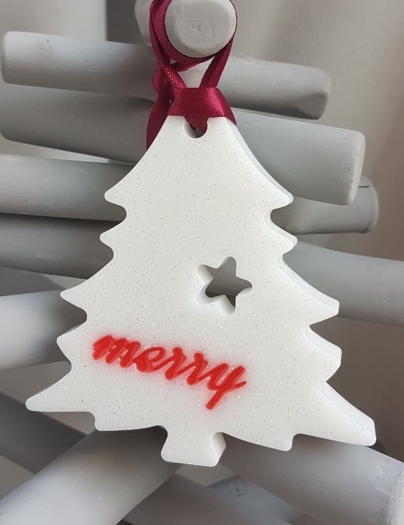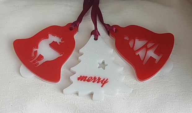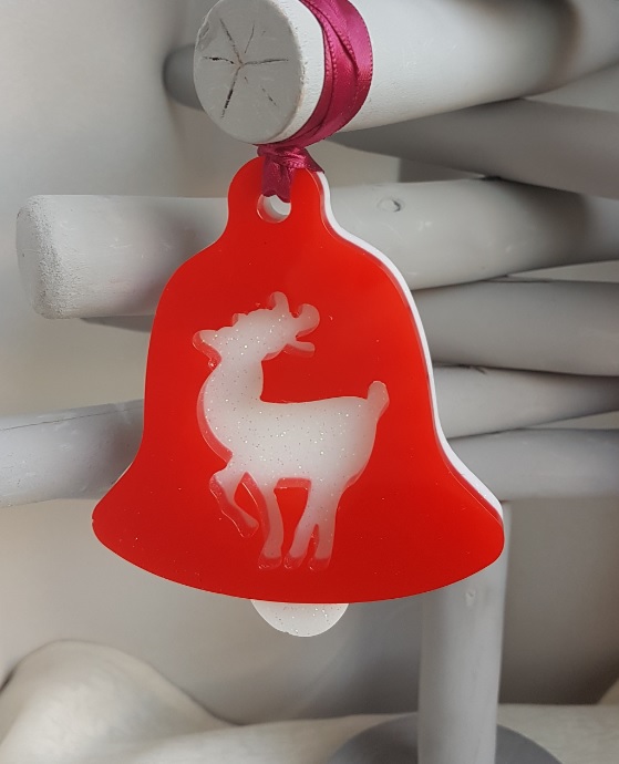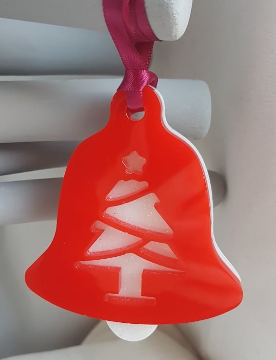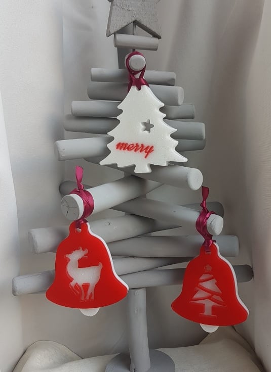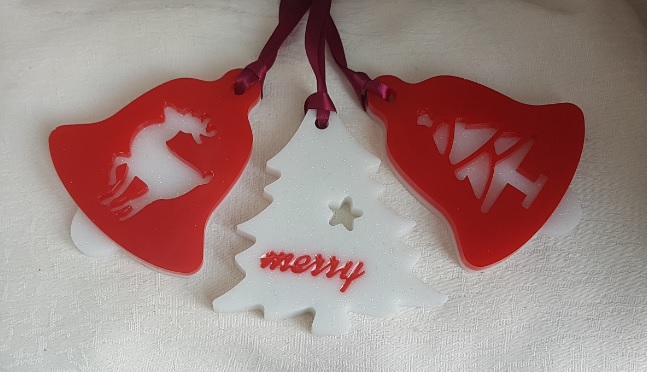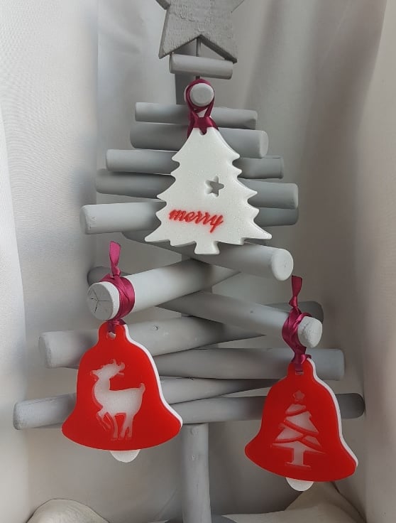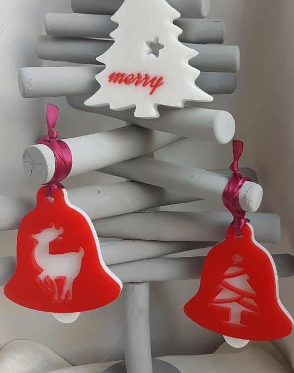 Decoration sizes Bells are approx 9.5cm (H) x 7.5cm (W) x 1cm thick. Wine Satin Ribbon length is approx 10cm long. Tree decoration is approx 9cm (H) x 8.5cm (W). Bell shapes are Bright Red Resin backed with glittery White resin with a tree and reindeer pattern. Tree shape is glittery white resin with Red Merry wording.