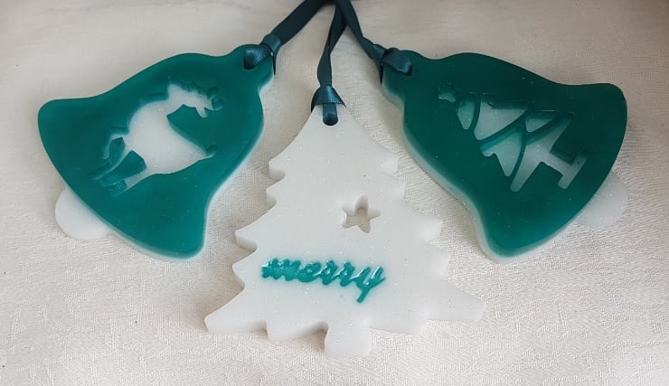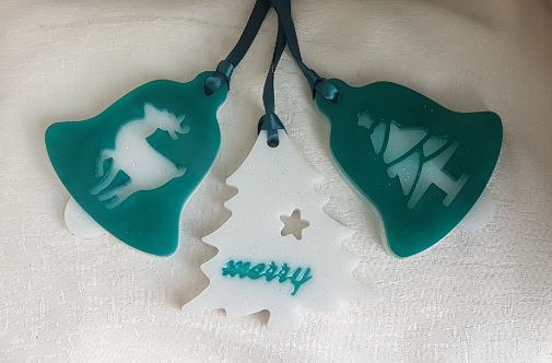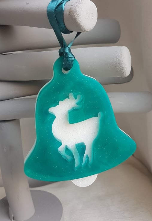 Gorgeous set of 3 Christmas decorations made of Turquoise and glittery White resin. The set consists of two bell shapes with a Christmas tree and Reindeer on them and a Christmas Tree shape with the word Merry on it. They come on a gorgeous Teal Satin ribbon.
