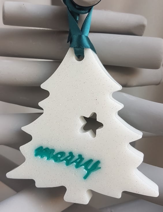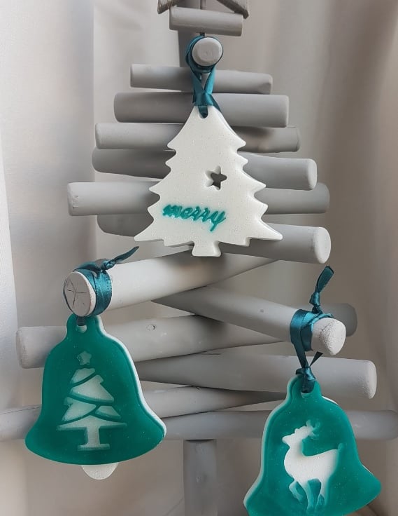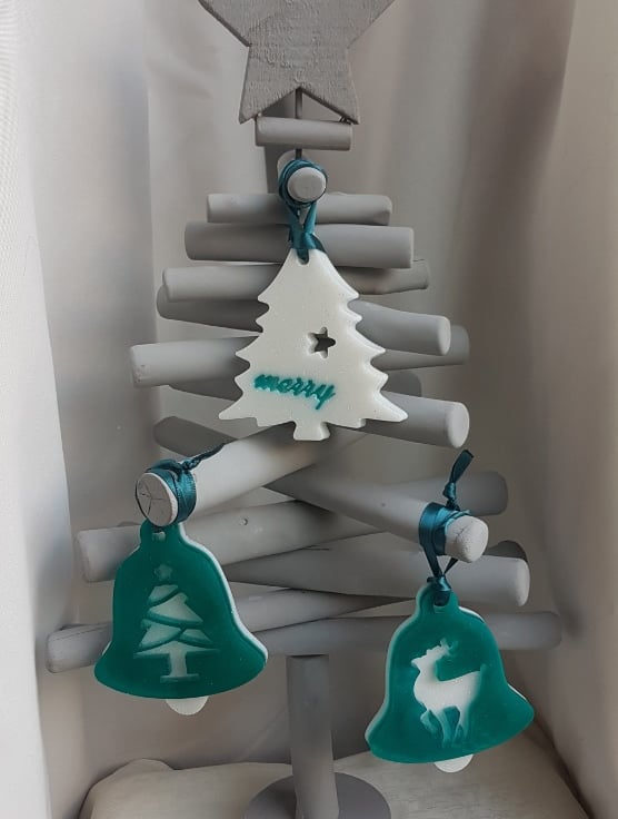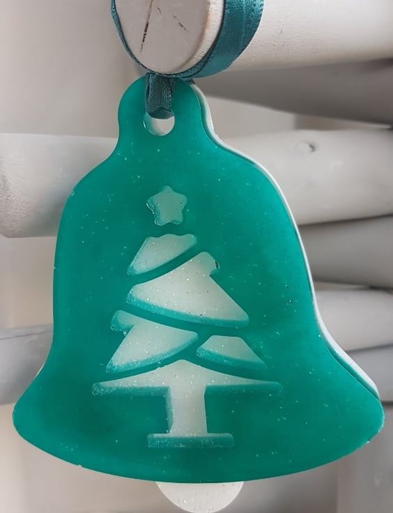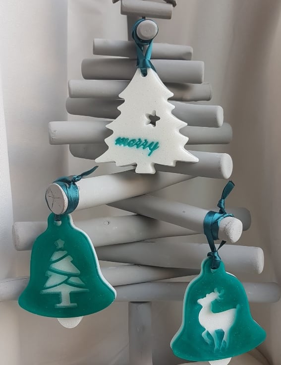 Decoration sizes Bells are approx 9.5cm (H) x 7.5cm (W) x 1cm thick. Teal Satin Ribbon length is approx 10cm long. Tree decoration is approx 9cm (H) x 8.5cm (W). Bell shapes are Turquoise Resin backed with glittery White resin with a tree and reindeer pattern. Tree shape is glittery white resin with Turquoise Merry wording.