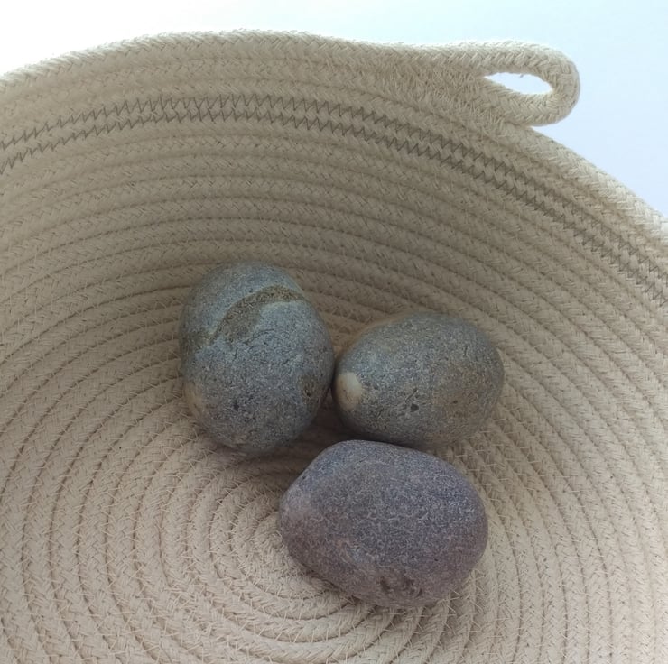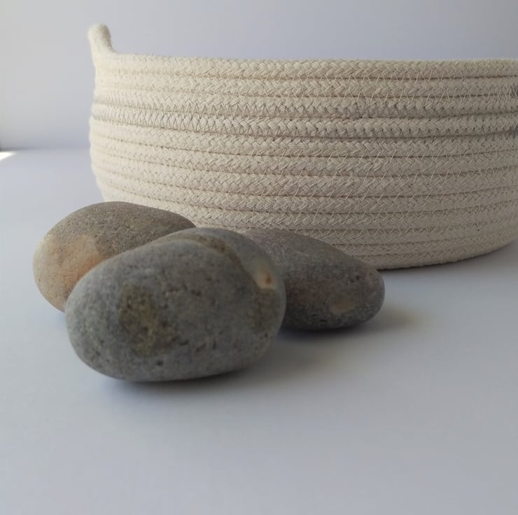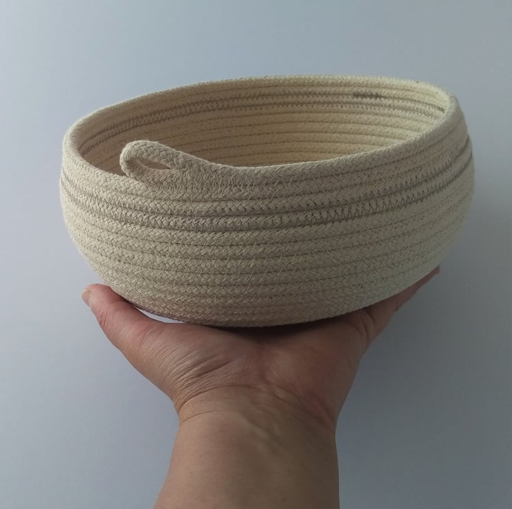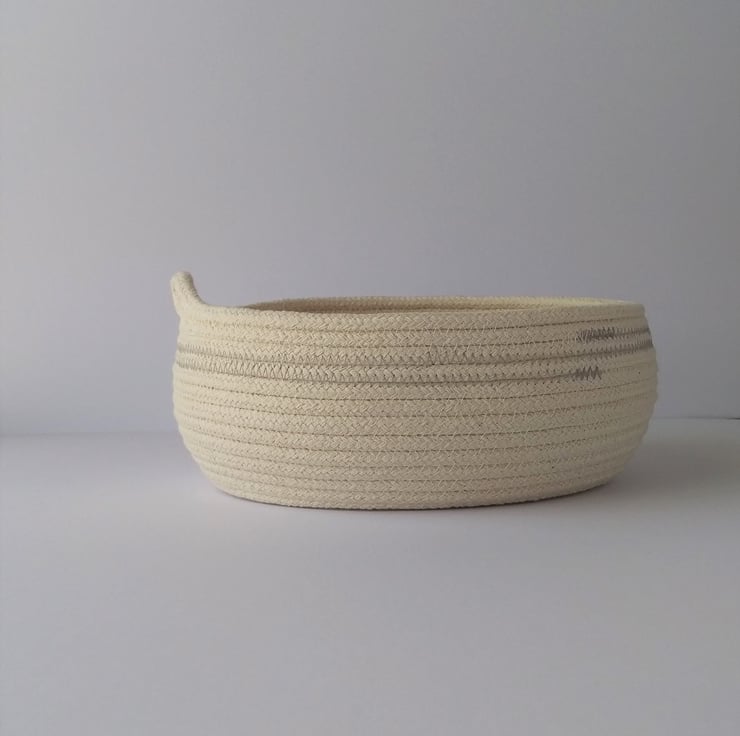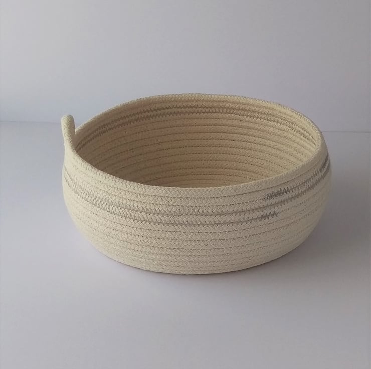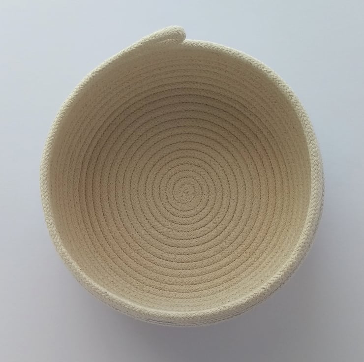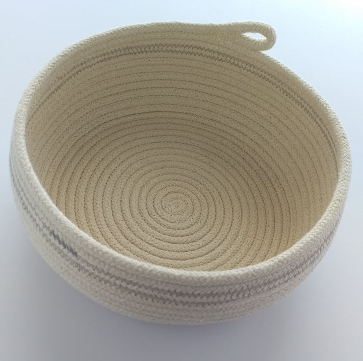 A spiral of unbleached cotton rope has been machine stitched to form this simple and elegant Seaview Bowl, which has been finished with a band of colour in 'Squall'