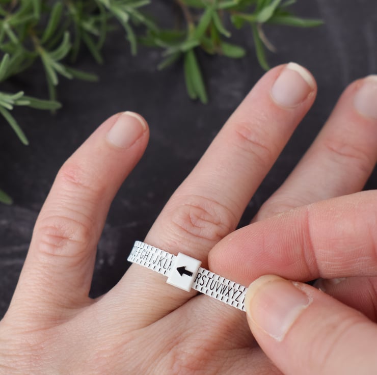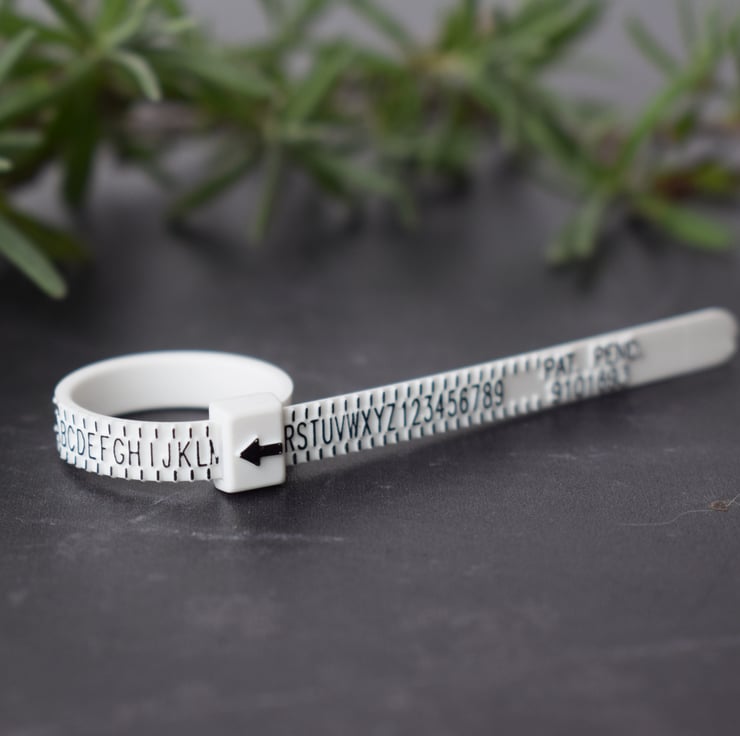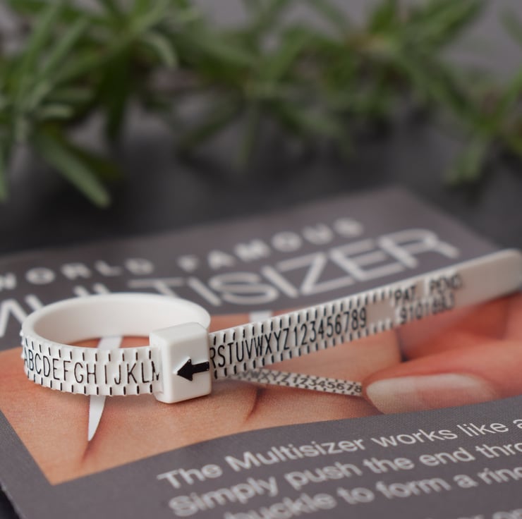 This reusable plastic multi ring gauge is a quick and easy way to measure your UK ring size. Simply thread the end through the buckle like a belt, place over the finger and pull until it gives a comfortable fit, making sure it fits over your knuckle. You can then read off the size from the arrow (size M shown). Full instructions are included on the packet.