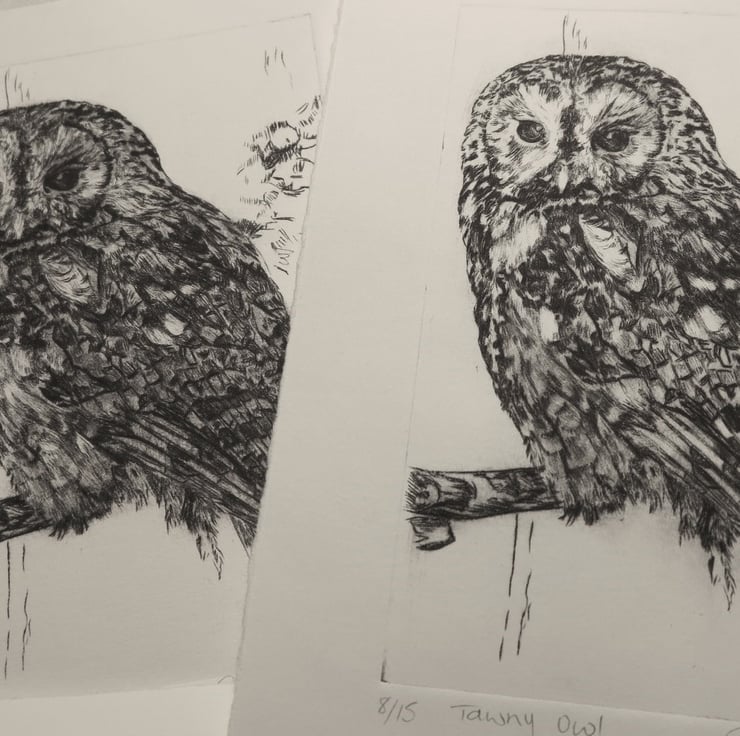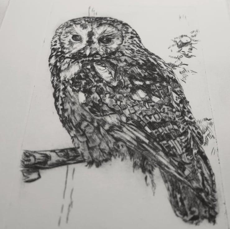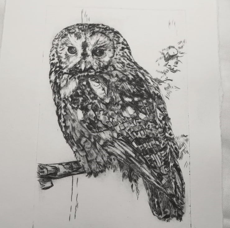 This drypoint etching of a beautiful tawny owl was made by scratching tiny lines into a plexiglass plate using fine etching tools. it is hand printed on Fabriano paper using soy-based Akua ink and measures 4" x 6".