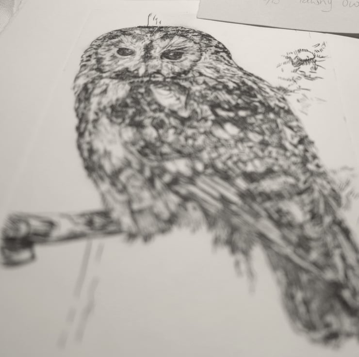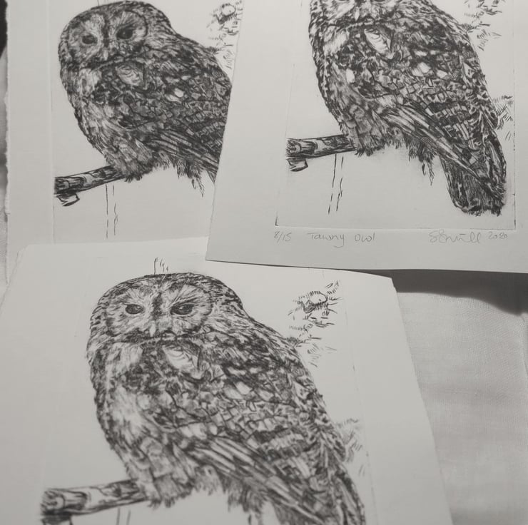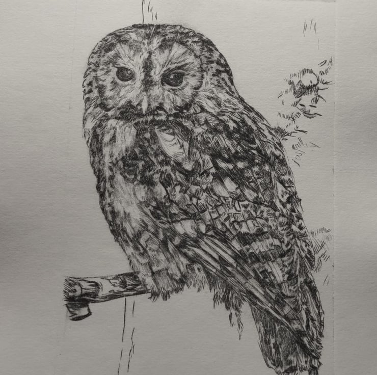 This drypoint etching of a beautiful tawny owl was made by scratching tiny lines into a plexiglass plate using fine etching tools. it is hand printed on Fabriano paper using soy-based Akua ink and measures 4" x 6".
