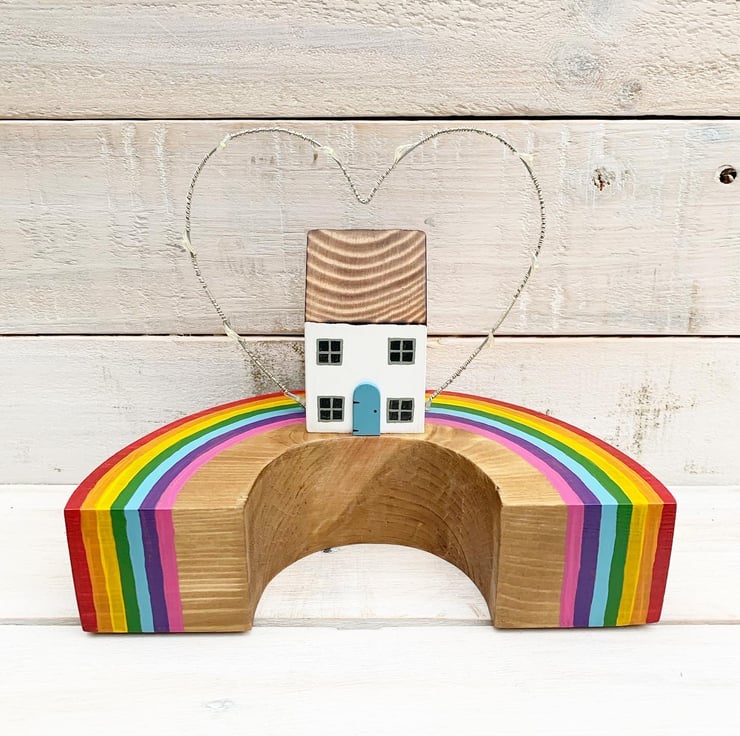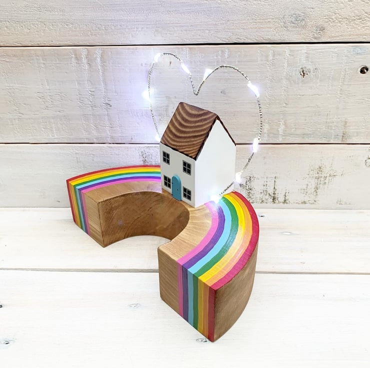 Crafted by hand from wood with wire heart arching over house with mini fairy lights
