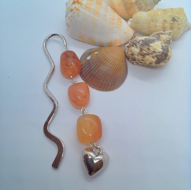 This pretty and practical silver plated bookmark would make an ideal gift for any book lover that you know, or a treat for yourself. The bookmark is silver plated and in the shape of a squiggle. It has 15 mm x 15 mm silver plated puffed heart charm and 3 Red carnelian nugget beads measuring approx. 15 mm x 12 mm each. These are linked together in a rosary style measuring 8.5 cm in total from the bookmark. The bookmark is 8 cm in length. The bookmark will be dispatched wrapped in tissue paper in an organza bag and delivered to you via Royal Mail first class post.