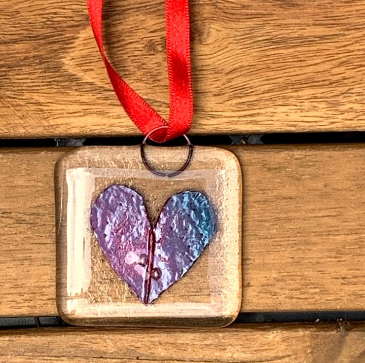 This glass hanging decoration has a copper heart fused between sheets of glass, because of the nature of kiln fused glass when the copper foil oxidises it can turn any thing from red to green.