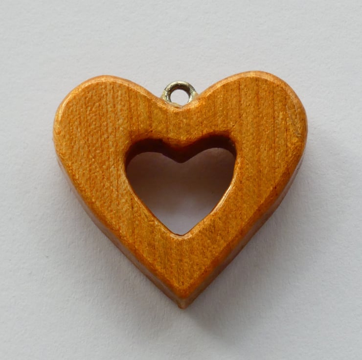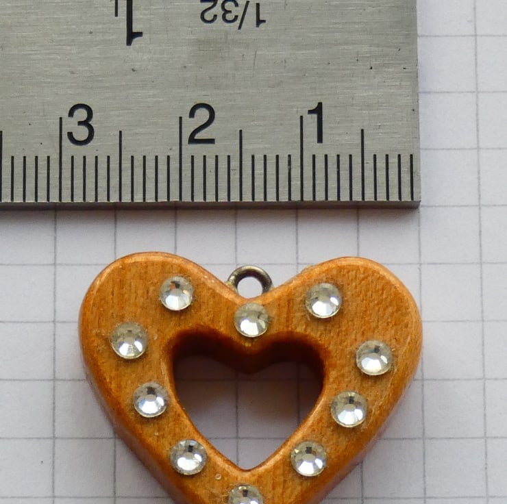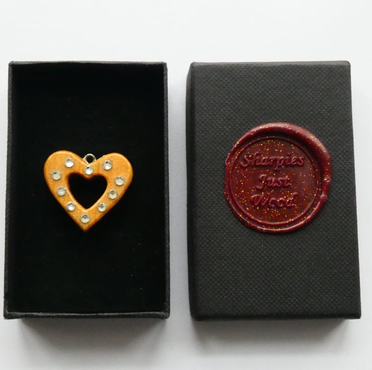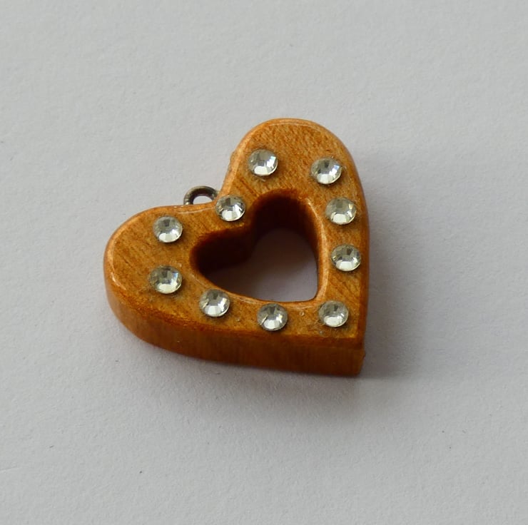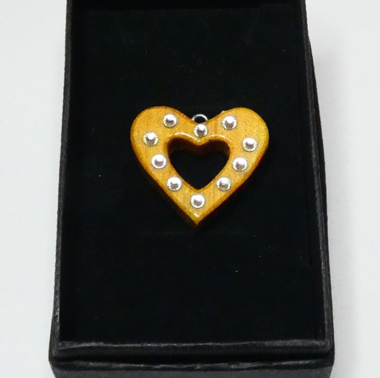 This heart pendant was cut and shaped from a piece of wood before being sanded to a smooth finish. Ten crystals were then glued to the heart. It is smooth to the touch and has been finished with several coats of Lacquer to enhance the grain whilst also protecting the pendant.
