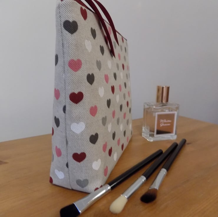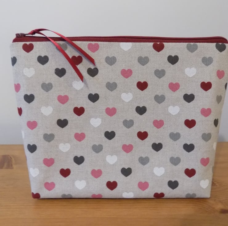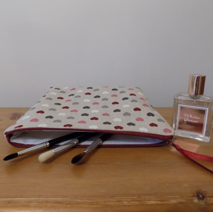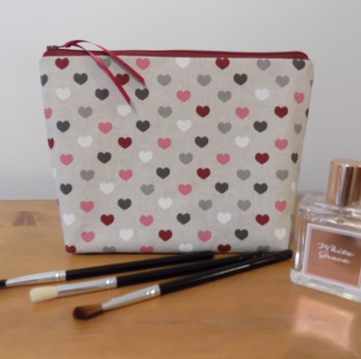Made with a high quality cotton rich linen fabric, it features pink, burgundy, grey and white hearts on a beige background.
