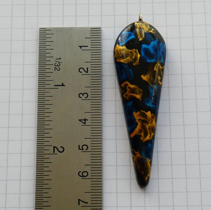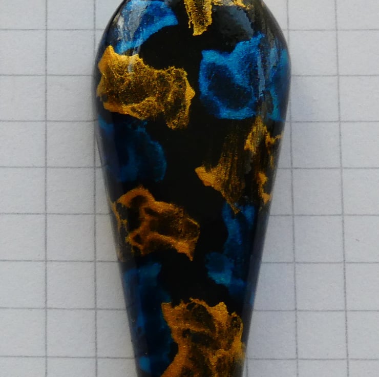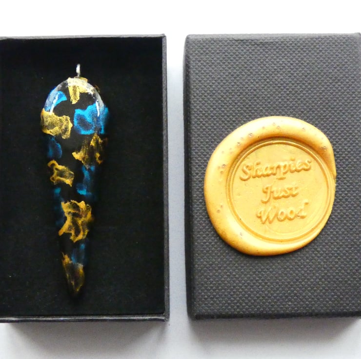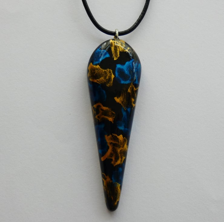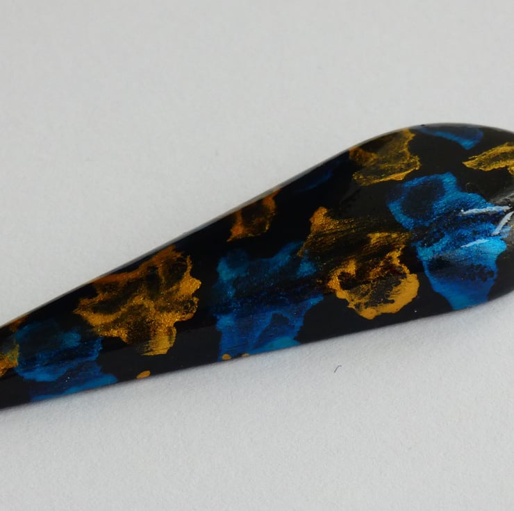 This pendant was cut and shaped from a piece of wood before being sanded to a smooth finish. It was painted with black paint before the blue and gold iridescent paints were applied. Each colour started out life as a single droplet of paint and then an airbrush was used to blow and spread out the paint to create the pattern that you see. It is impossible to recreate the exact pattern due to the unique way in which the patterns are formed. It is smooth to the touch and has been finished with several coats of Lacquer to enhance the colours whilst also protecting the pendant.