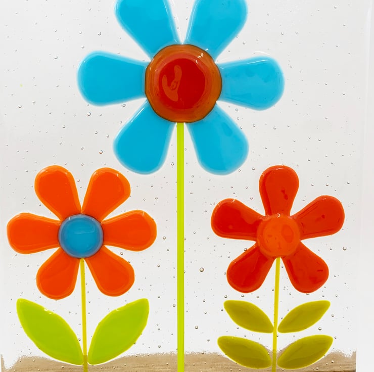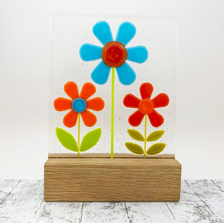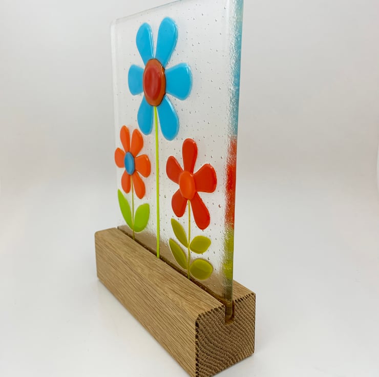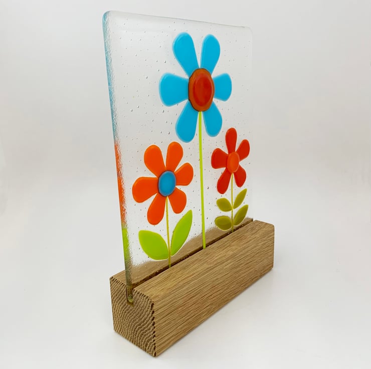 To make this piece I hand cut transparent art glass and then slowly fuse it in my kiln overnight to form a solid clear base. I then hand cut and shape art glass in tones of opaque turquoise, orange, red and green and arrange onto the pre-fired background. This all goes back into the kiln for a second slow overnight firing at a lower temperature to tack fuse the flowers onto the transparent background, this lower temperature means the flowers, stem and petals stand slightly proud of the glass, to give it a slightly 3D effect. I then mount the piece on a chunky solid oak block.