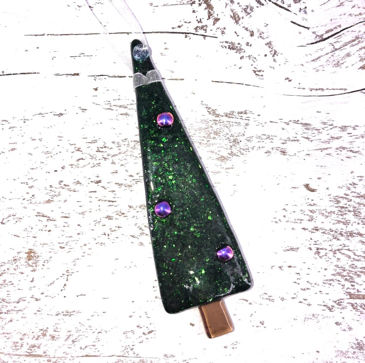 The tree is decorated with sparkly purple dichroic glass beads. The piece measures approx. 3.5 x 8cm and comes on a length of white organza for hanging.