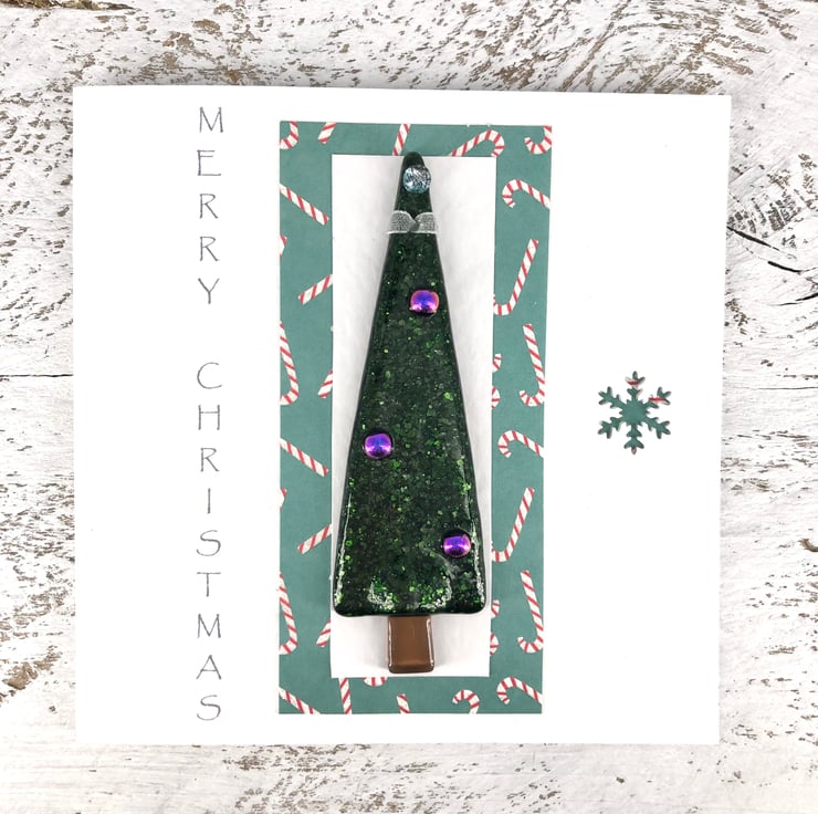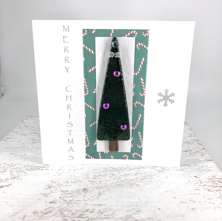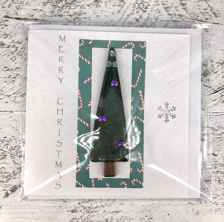 A lovely handmade card with a sparkly green tree decoration - the perfect card and gift in one!
