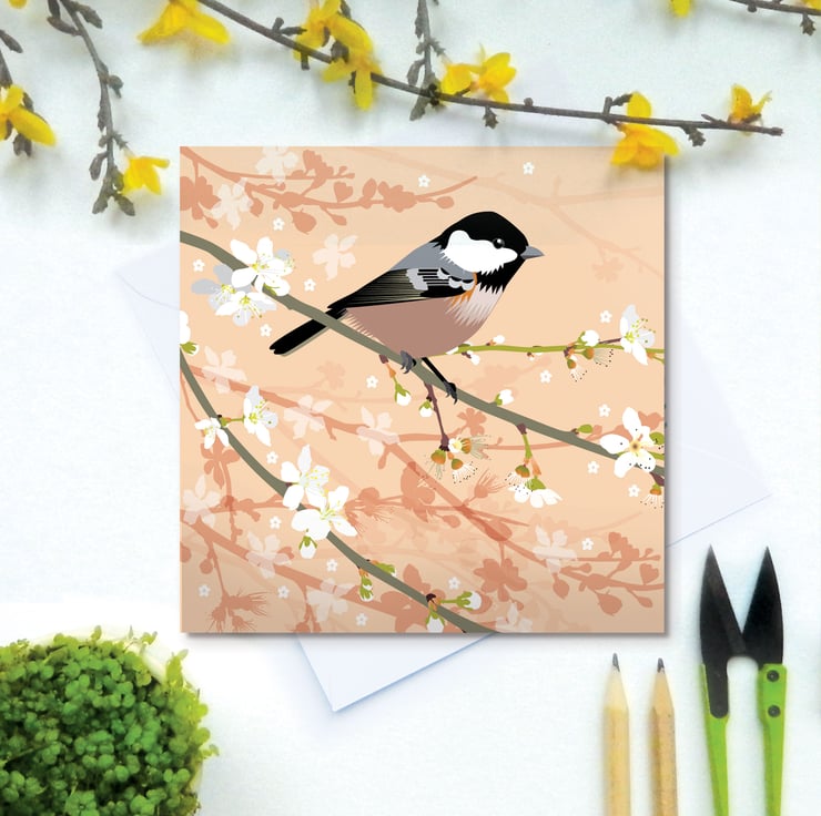 Cute little Coal Tit sitting on a branch of Plum Blossom stems! Beautiful Spring birthday card or just for anyone who loves British Birds!
