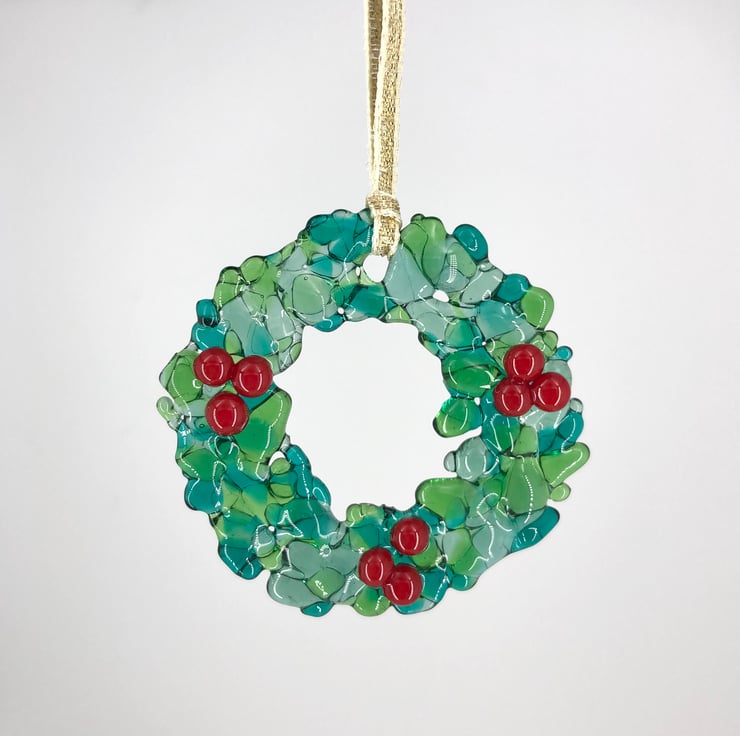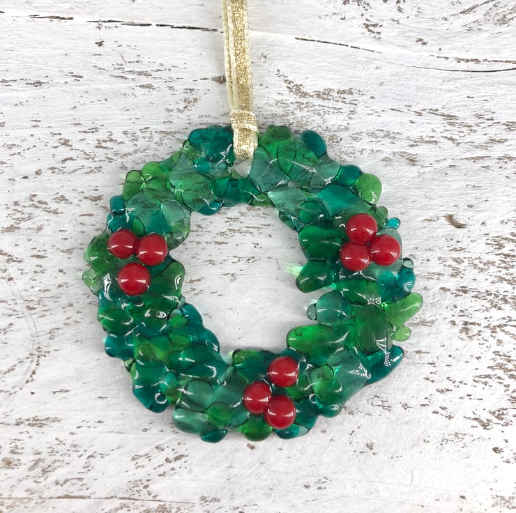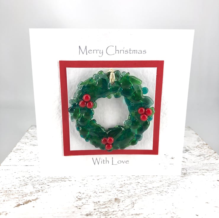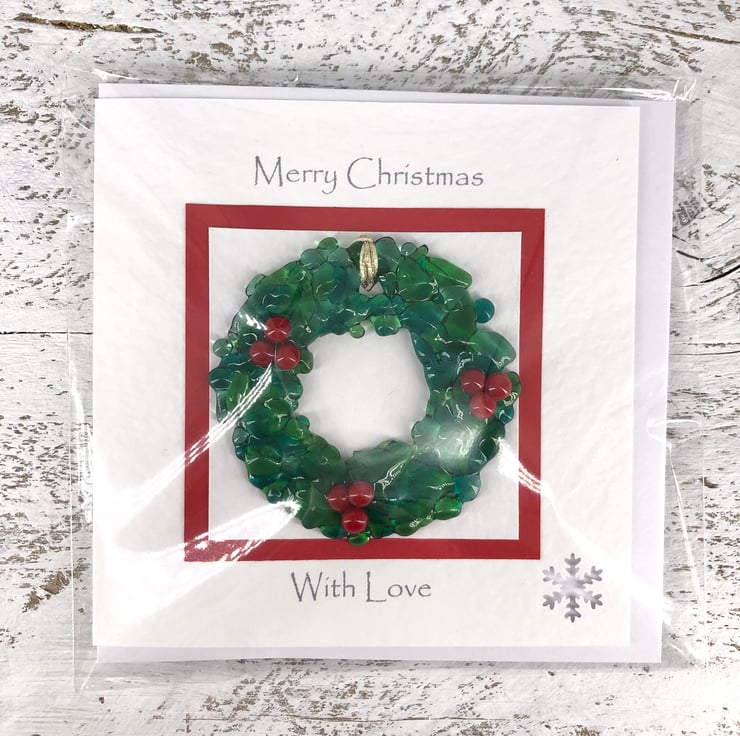 A lovely handmade card with a gorgeous glass holly wreath decoration - the perfect card and gift in one!