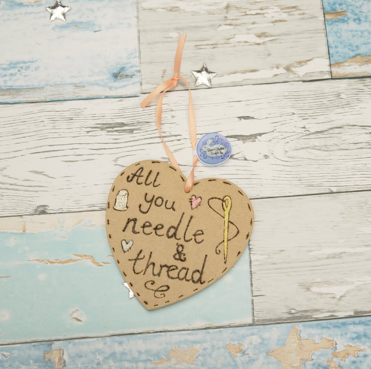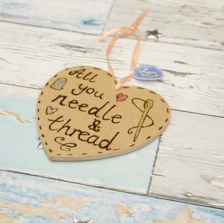 On the reverse side is another Sew phrase 'All you needle & thread' next to 'you' is a silver thimble, on the opposite side of the heart is a gold needle. This side also features two little red and blue hearts. Each side has been burnt and painted by hand and has a stitch line around the edge. A peach ribbon has been added to hang from and both sides are coated in a gloss finish.
