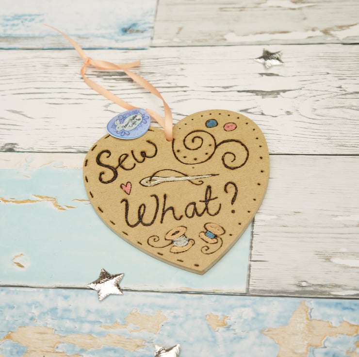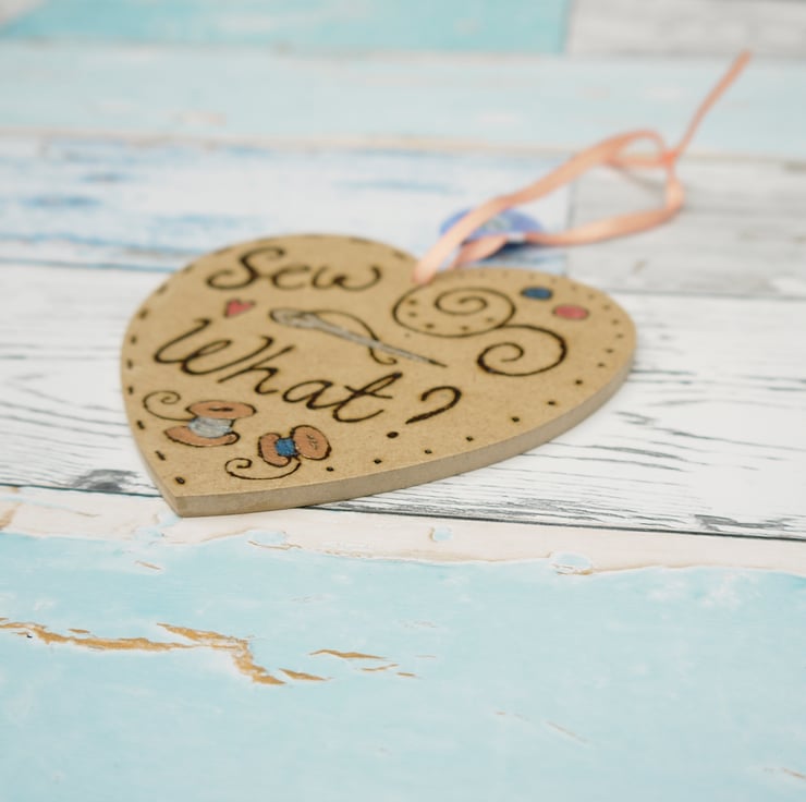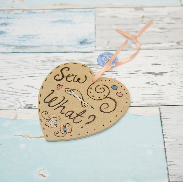 The front side has the words 'Sew What?' pyrographed into the wood, at the top right of the heart is a swirl with two buttons above and in between the wording is a silver needle and thread motif. Beneath the 'What?' are two bobbins in a dark and light blue. A small red heart sits next to the needle.
