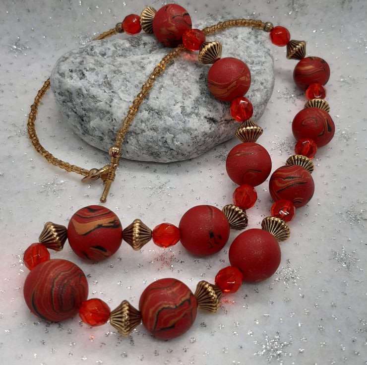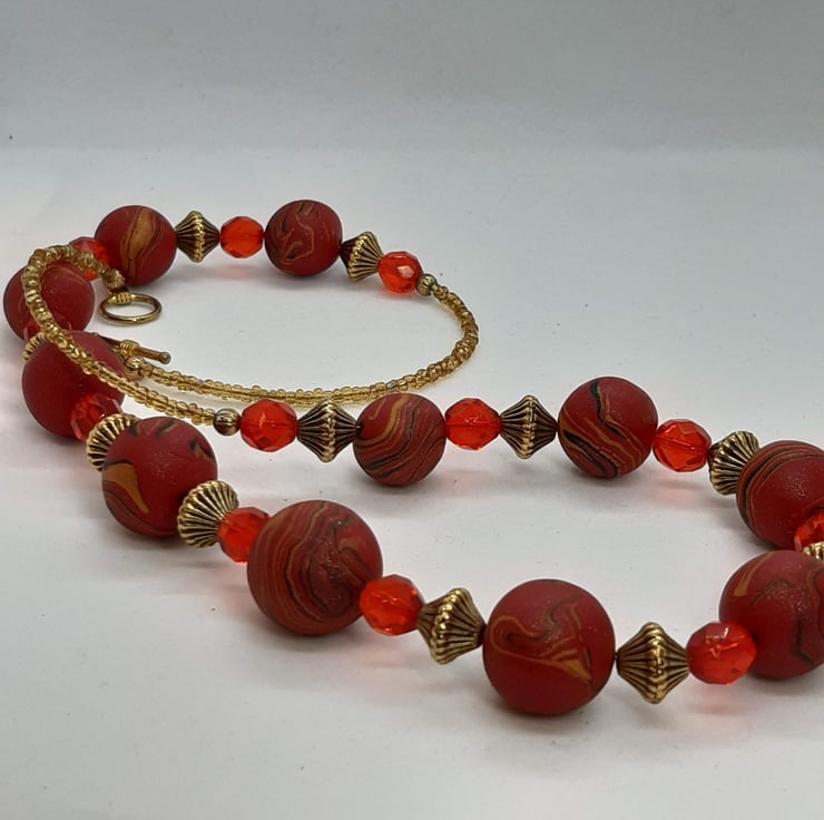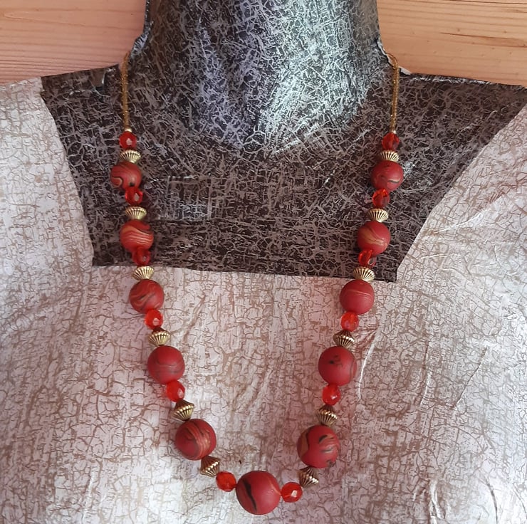 A stylish handmade necklace featuring polymer clay rounds beads in orangey red gold and black interspersed with 8mm faceted beds and gold 9mm fluted beads and gold coloured seed beads to finish.