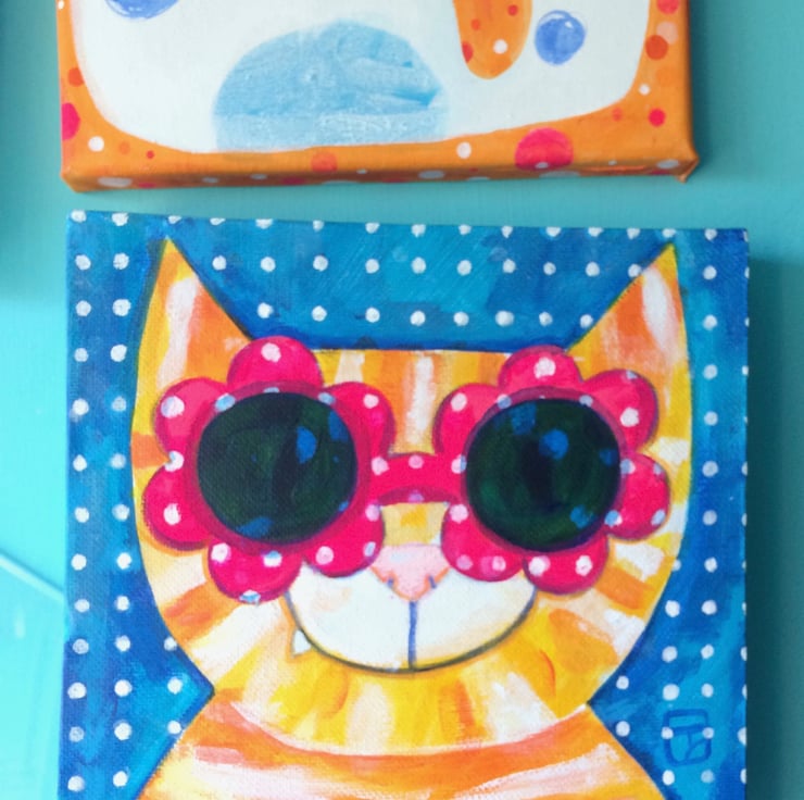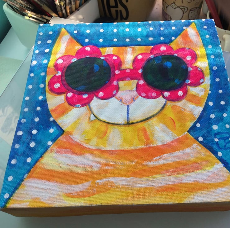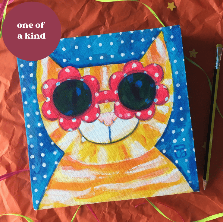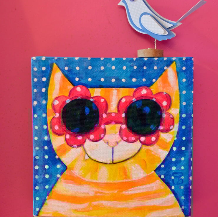 Another of my cats in sunglasses series, this one of a kind painting has a polka dot background. Vibrant colours