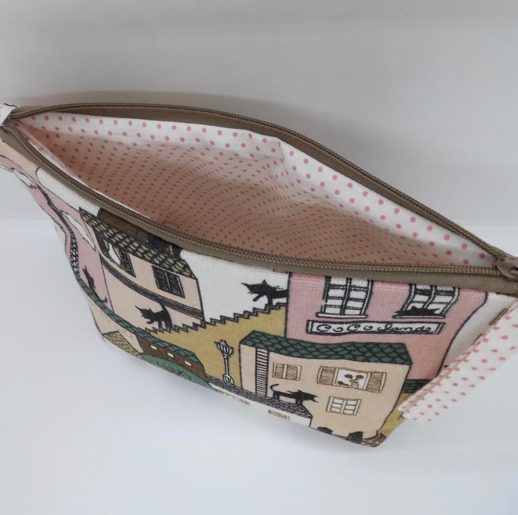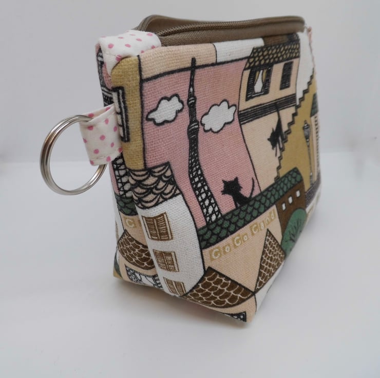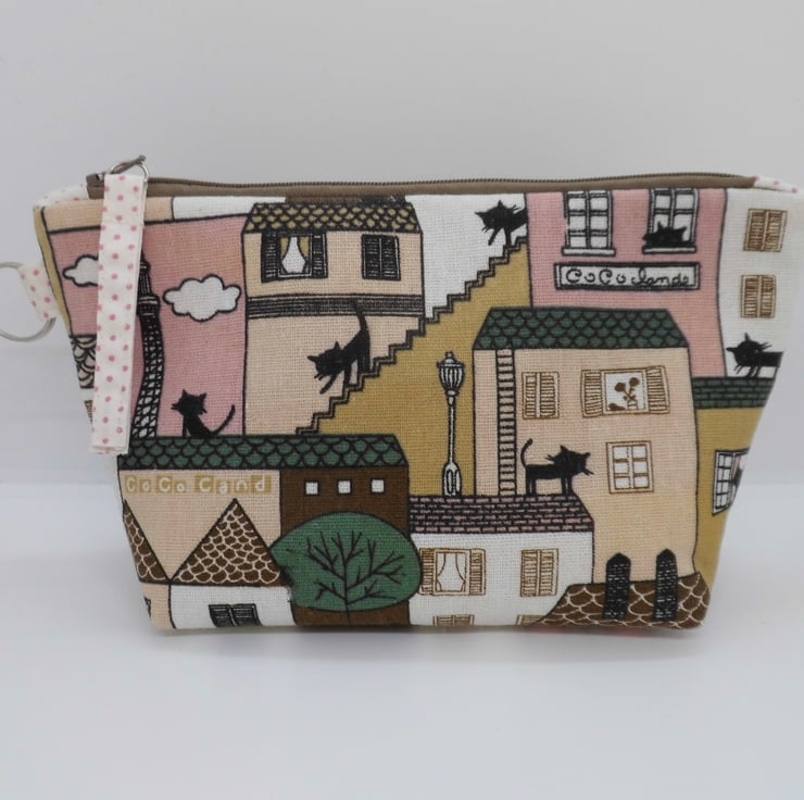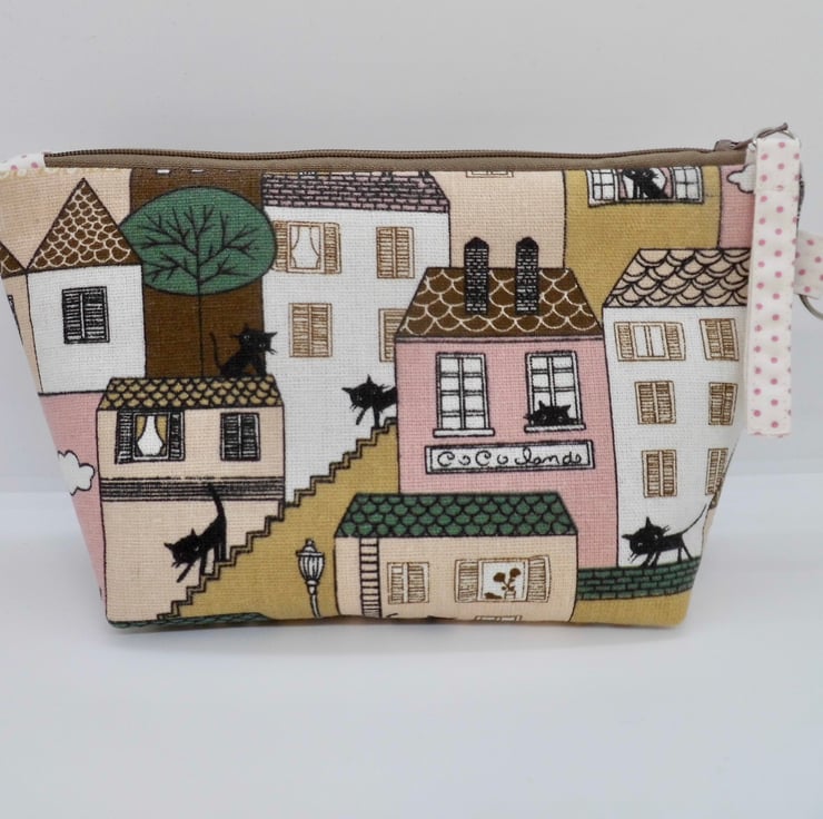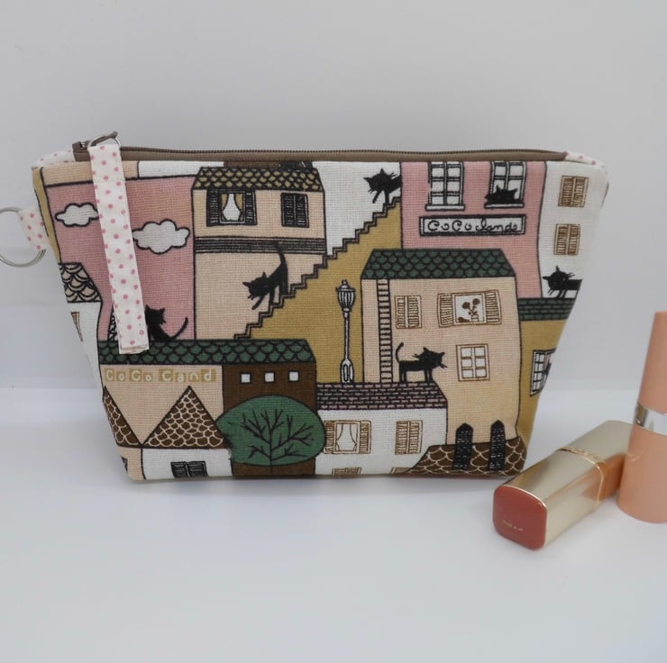 This zipped make up bag is made using a canvas style 100% cotton fabric of adventurous black cats. Soft pinks, beige, dark green and brown. Lined with pink and white spotty quilting cotton. The outer fabric has been backed with fusible fleece to give it some body and a quality feel. There is a beige zip across the top, finished with a fabric pull. It has a tab at the side with a key ring, ready to attach a bag charm, keys or other accessories.