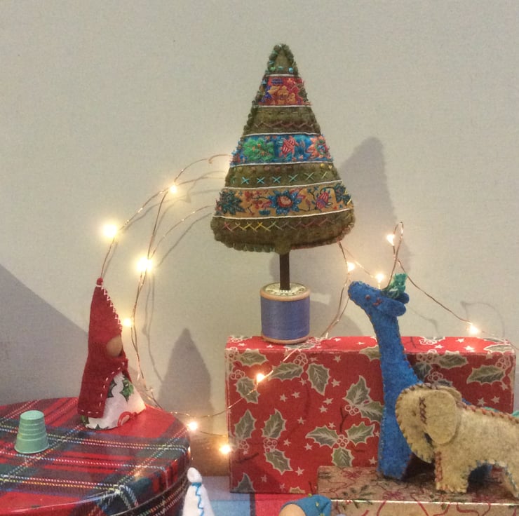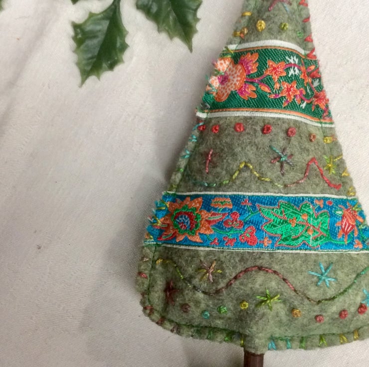 My latest Christmas tree design for 2020. A stylish colourful tree adorned with vintage braid and lots of hand embroidery.