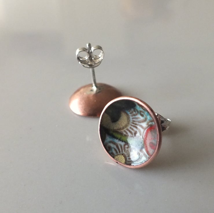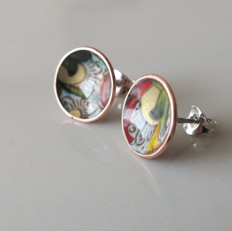 Beautiful enamelled copper earrings, with sterling silver posts. The earrings are cup shape, measuring 11 mm in diameter with a gold lustre and coloured pattern design