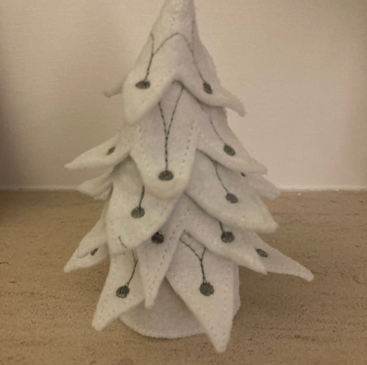Embroidered felt tea light White Christmas tree. Cute little white Christmas tree, that glows when the battery tea light is lit. Not to be used with a real flame tea light. A new tea light is supplied. 4 inches tall. Can be decorated with glitter, sequins, or just left plain.