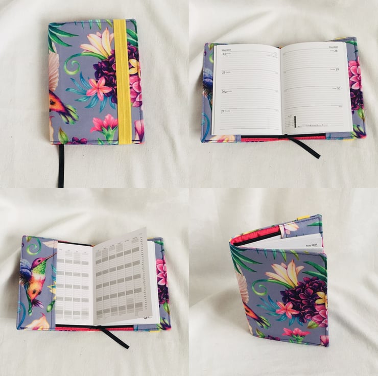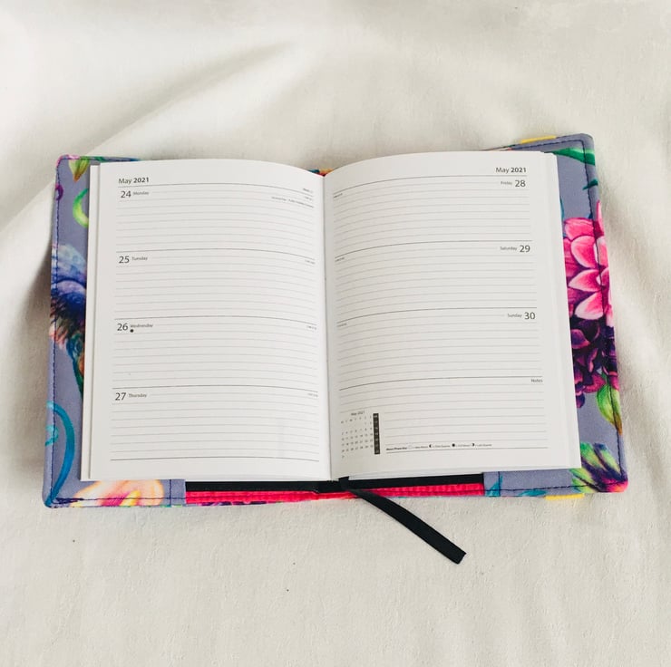 This is a beautifully covered hardback A6 week to view Diary. The cover has been made using water resistant fabric for the outside and lined with cotton fabric, finished with pretty elastic closure. The cover can be removed and used time and time again and being in water resistant fabric protects your diary from spills etc and can be wiped clean. The elastic bind, helps to protect your diary from falling open, inside your bag, keeping the pages crisp and clean.