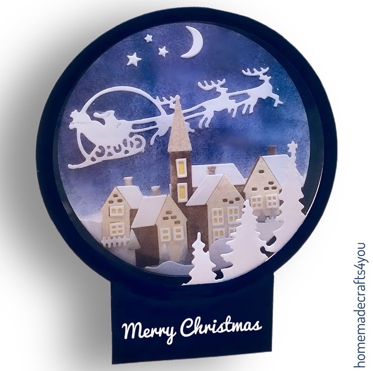 A globe, with Santa and sleigh flying over a village at night. The globe is made up of three circles with separate scene to give a 3D effect. As well as a lovely card to receive, it can be used each year as a Christmas decoration. A personalised message can then added to the card. Interested in a globe card but would like a different design then please email before ordering. If you email please be aware replies may go to your spam/junk folder. Each card comes with its own handmade envelope.