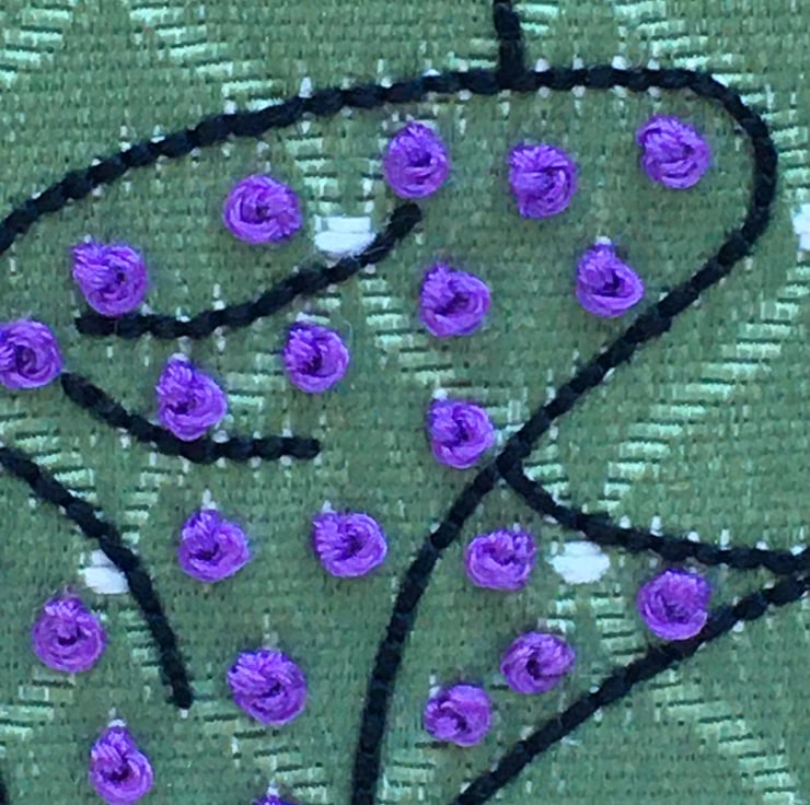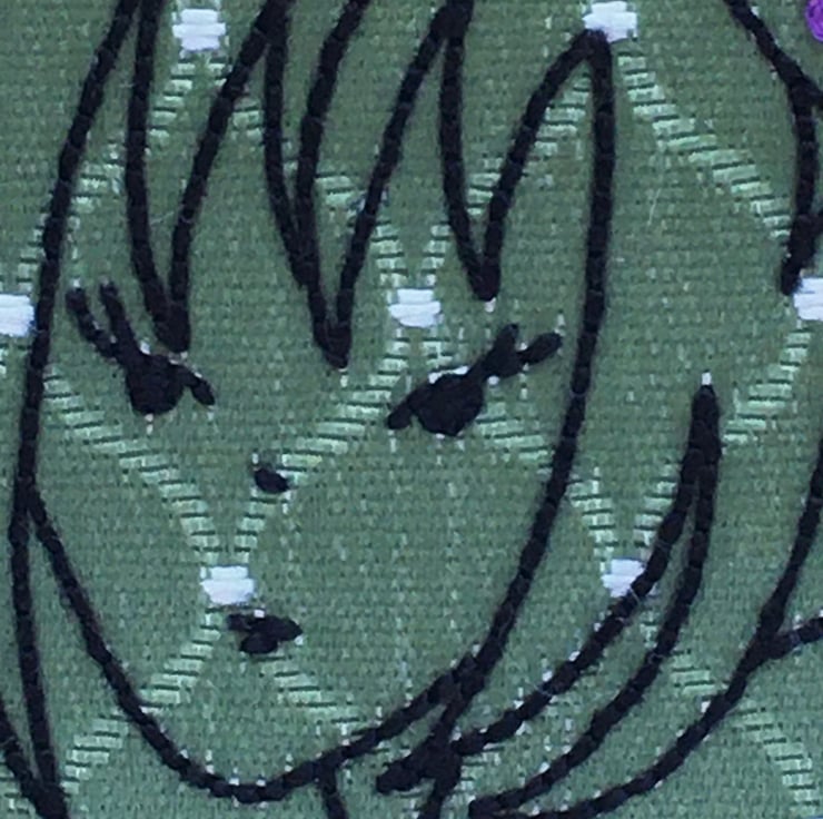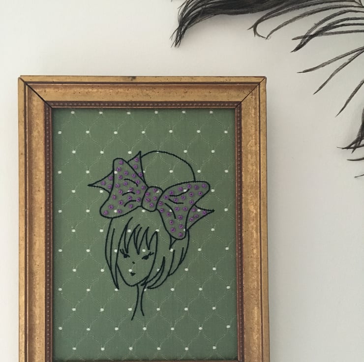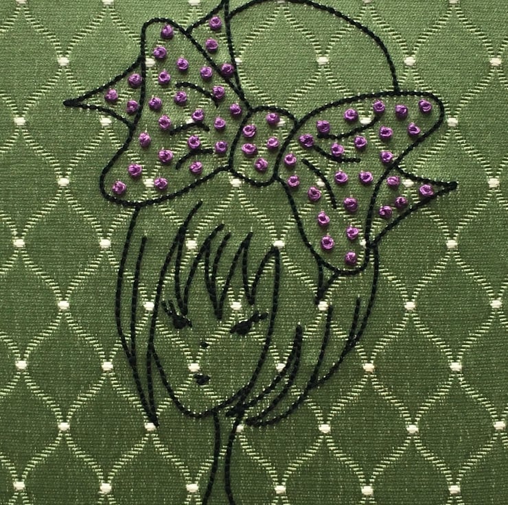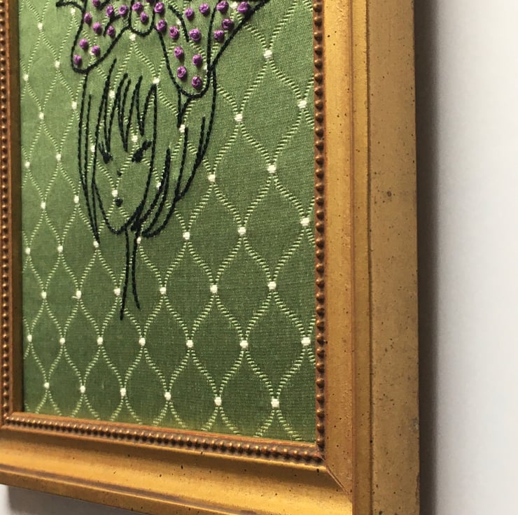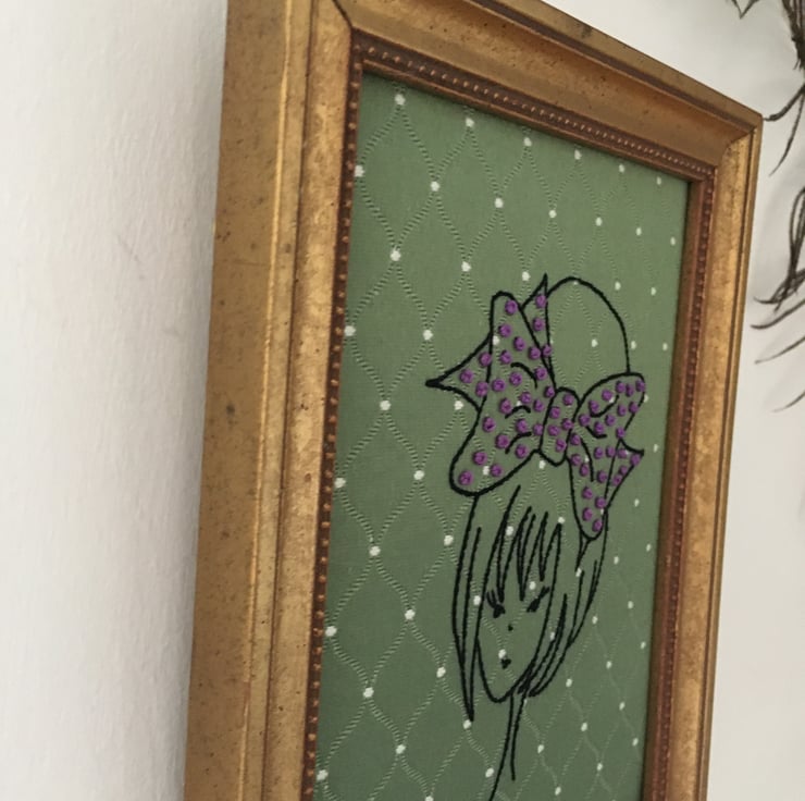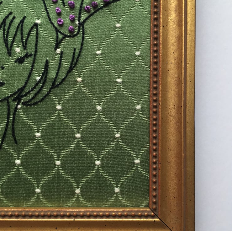 I have hand stitched her on a piece of 1960’s green Damask fabric using various embroidery stitches... I have adorned her bow with purple French knots.