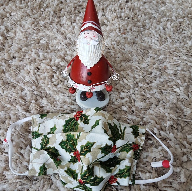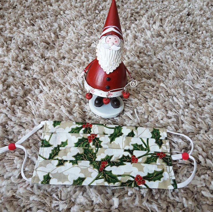 Small Adult/Teenager festive face covering made from a holly and berry print. The face mask is made with 2 layers of cotton forming an inner pocket for a filter (not included) and is fastened over the ears with 2 loops of elastic and a toggle adjuster.